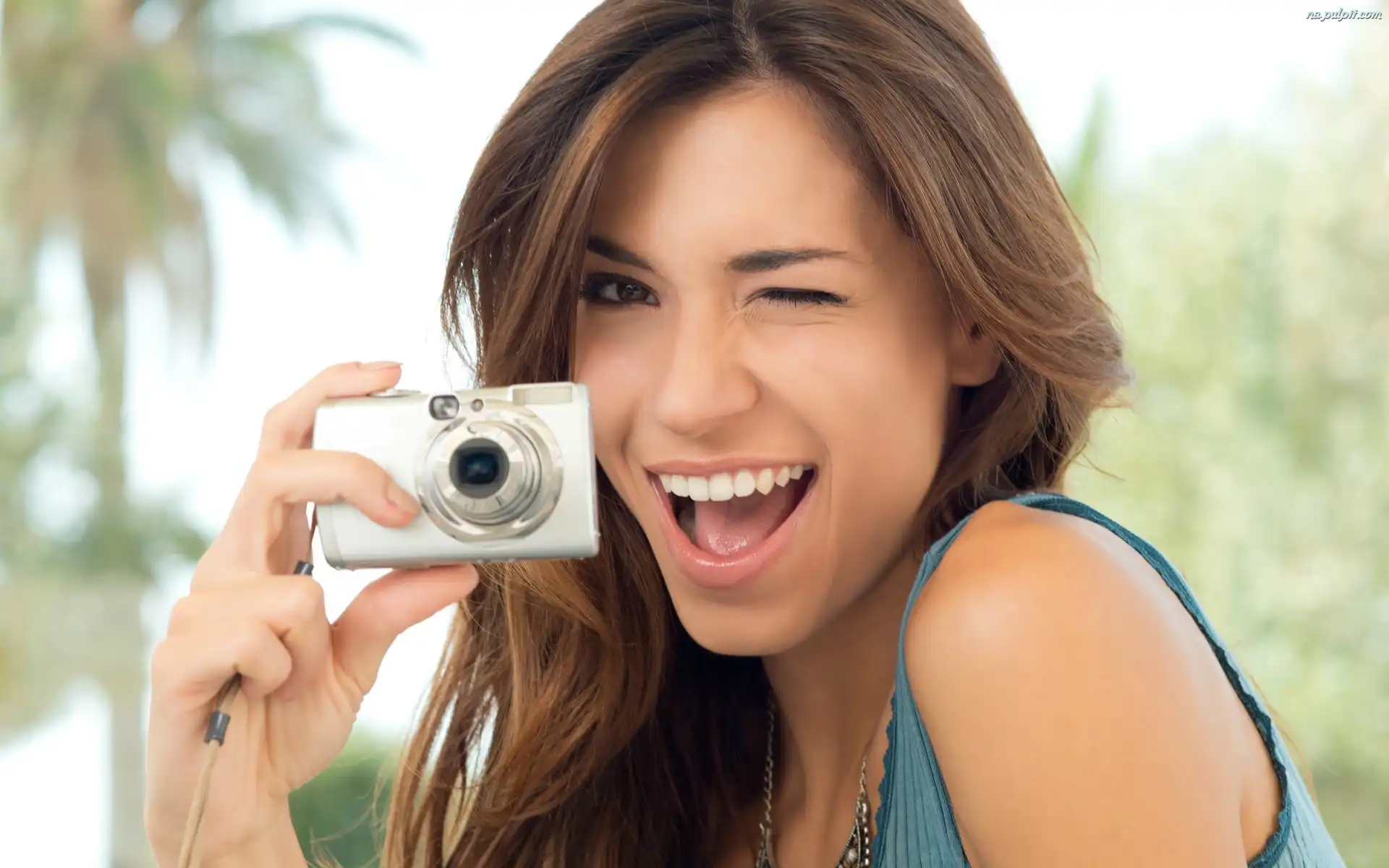 Fotograficzny, Brunetka, Uśmiechnięta, Aparat