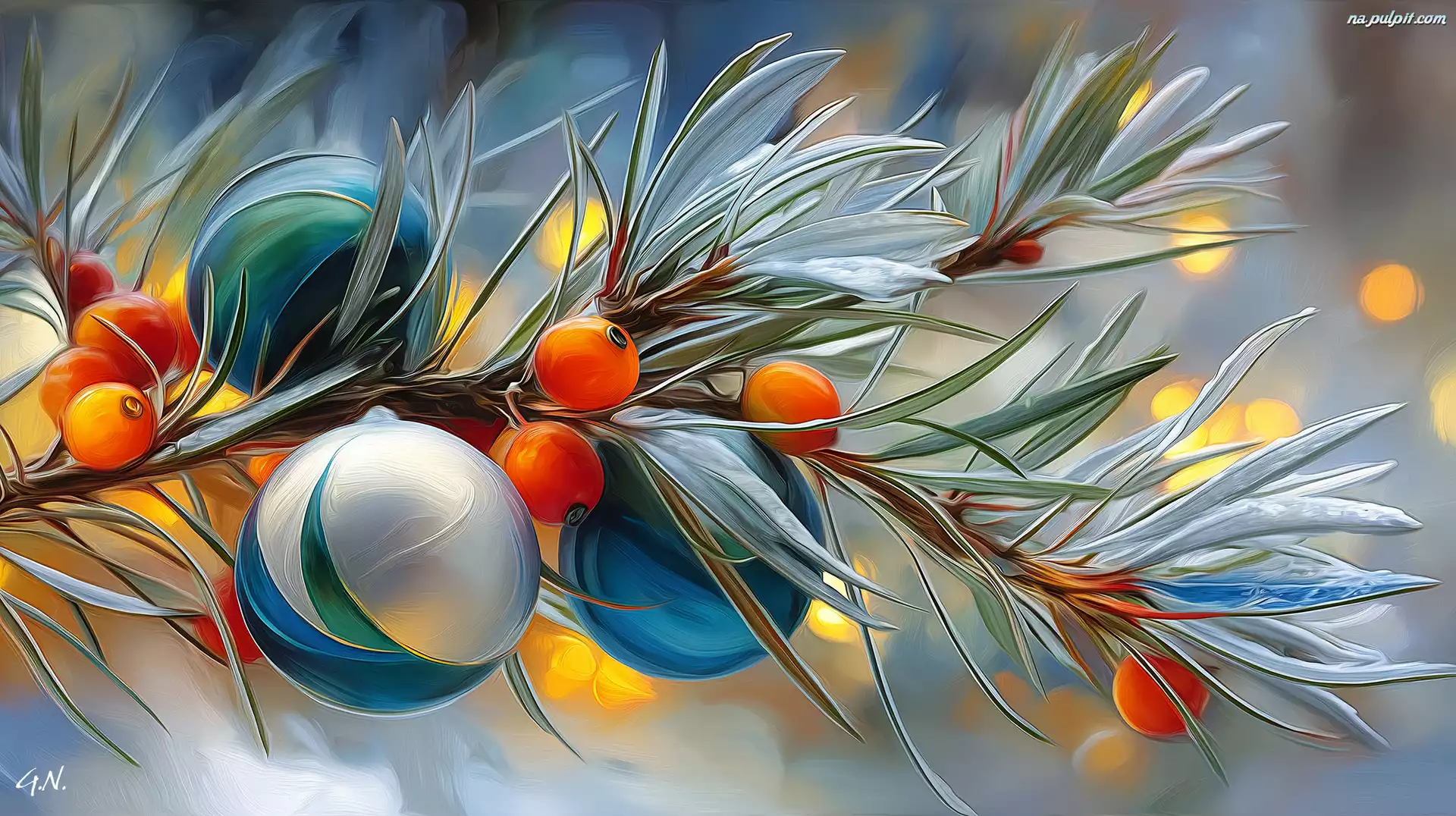 Grafika AI, Bombki, Gałązka, Boże Narodzenie, Owoce Na Pulpit