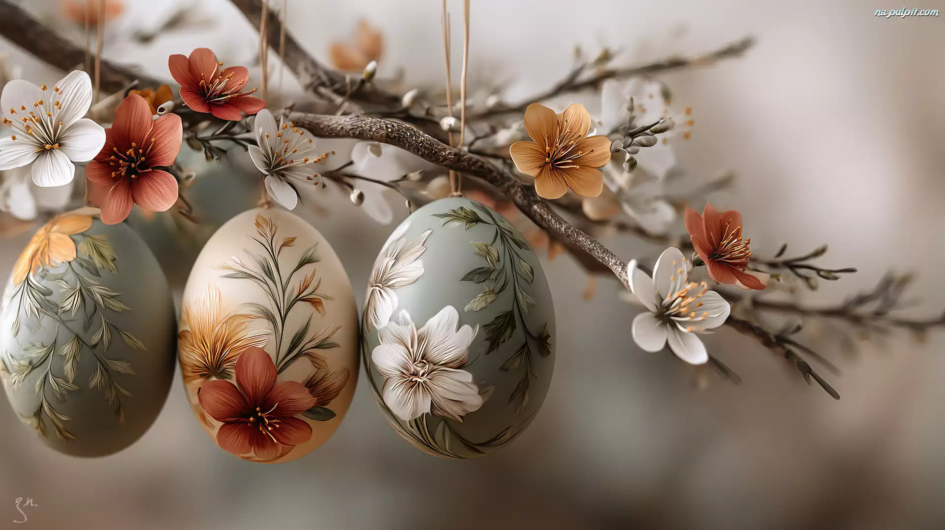 Kwiaty, Wielkanoc, Pisanki, Gałązka, Trzy, Grafika AI Na Pulpit