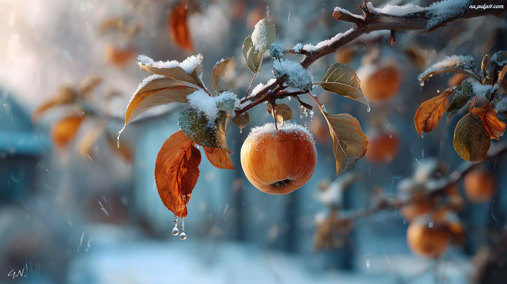 Jabłko, Gałązka, Śnieg, Grafika AI Na Pulpit