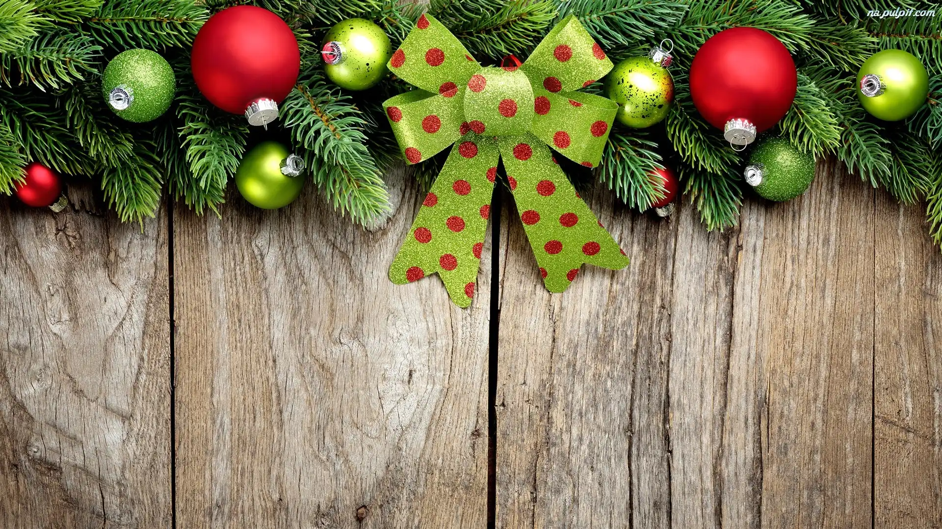 Deski, Gałązki, Kokarda, Czerwone, Zielone, Boże Narodzenie, Bombki