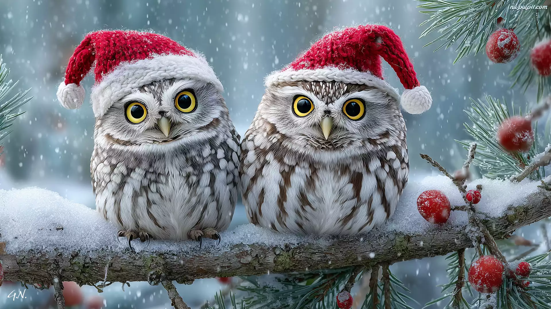 Zima, Dwie, Czapki, Gałązki, Sowy, Grafika AI Na Pulpit