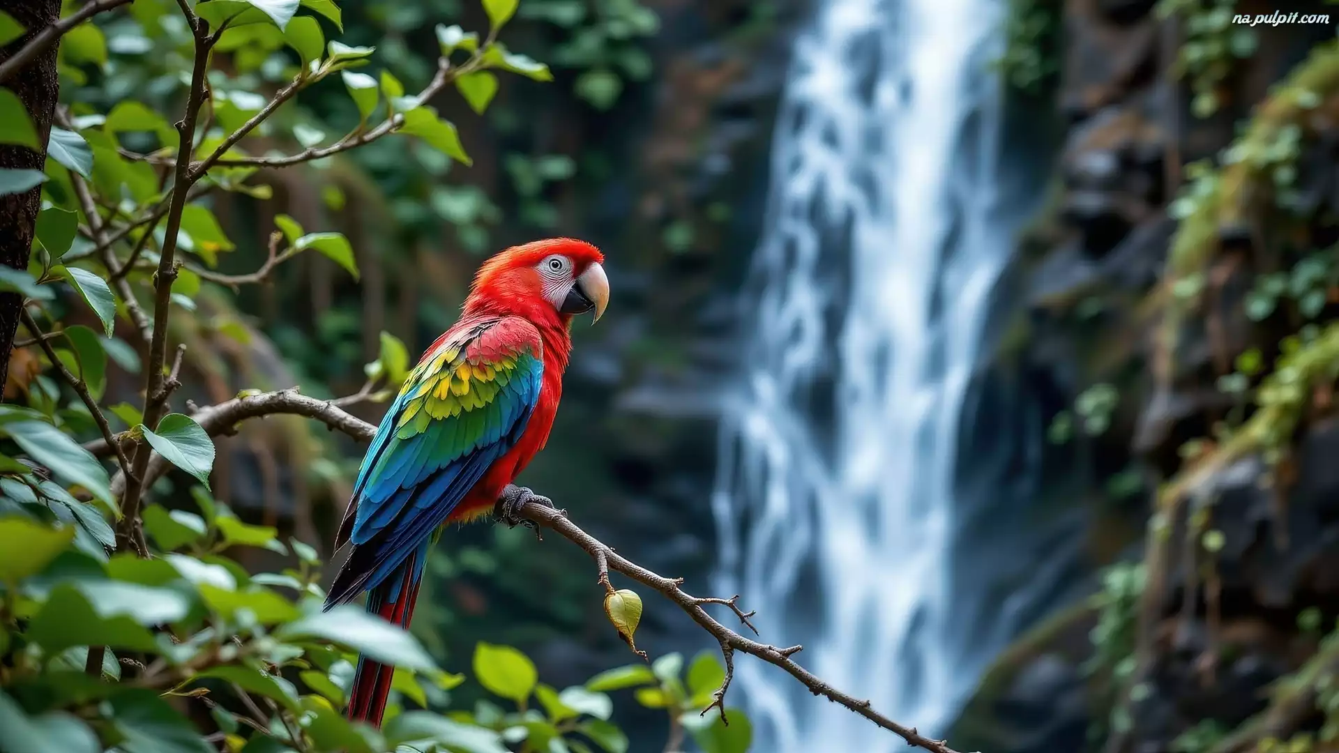 Wodospad, Papuga, Drzewo, Gałązki, Ara, Grafika AI Na Pulpit