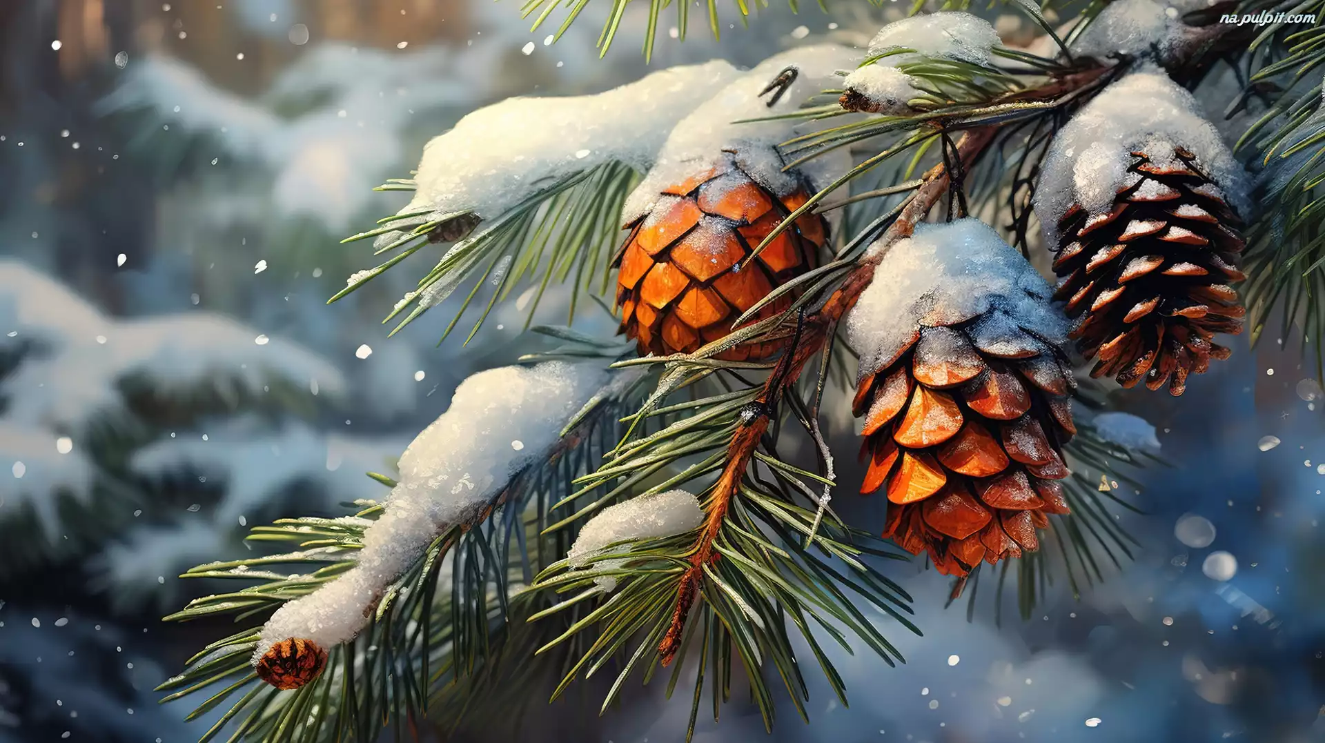 Sosny, Zima, Śnieg, Gałązki, Szyszki, Grafika Na Pulpit
