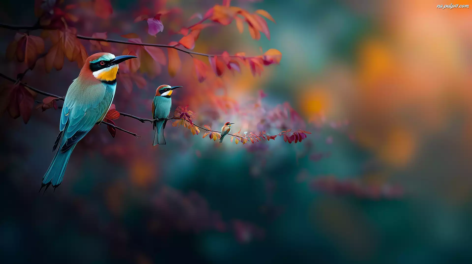 Jesienne, Ptaki, Liście, Żołny, Ai, Grafika, Kolorowe, Gałązki Na Pulpit