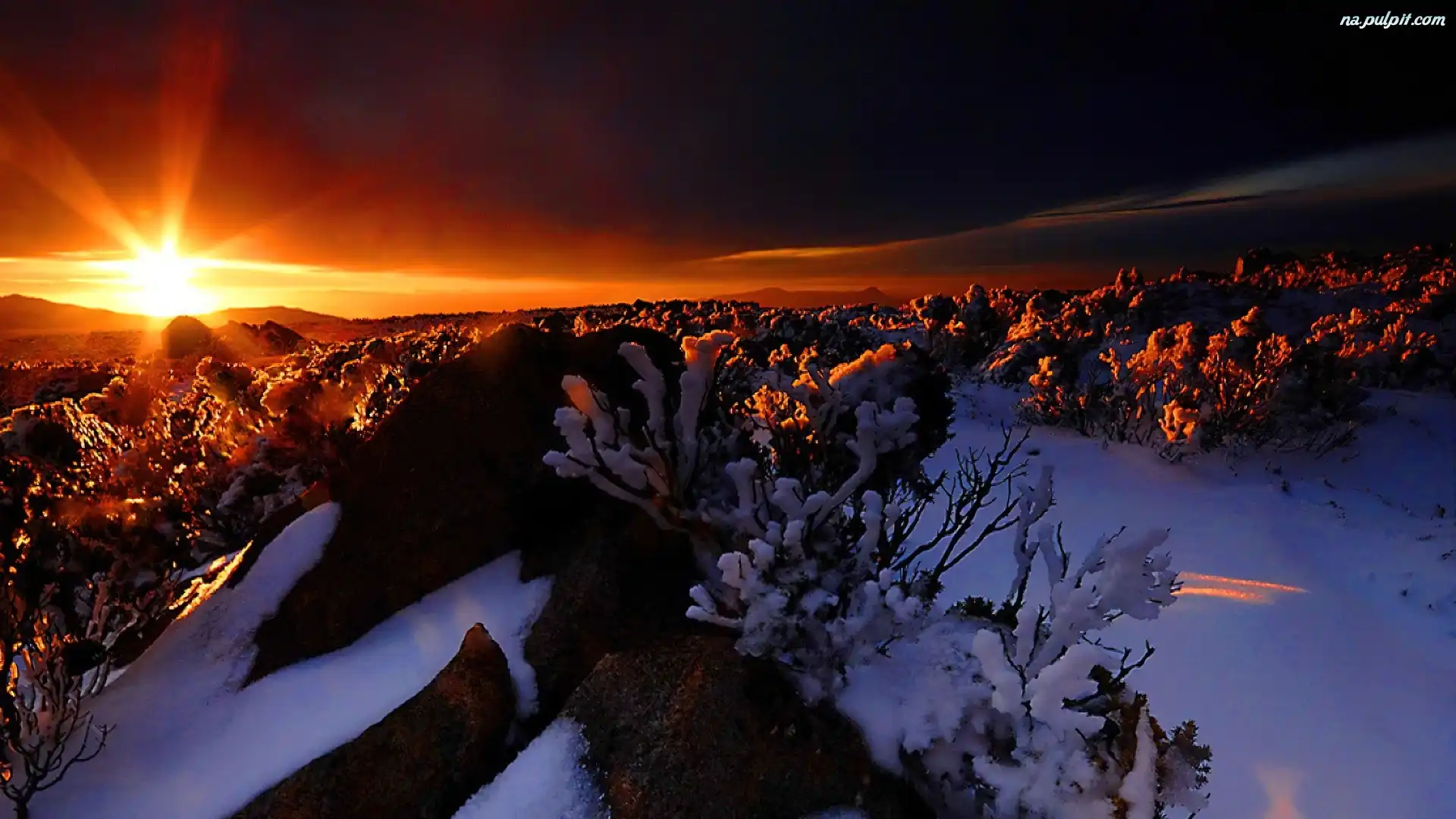 Gałązki, Skały, Zachód Słońca, Ośnieżone Na Pulpit