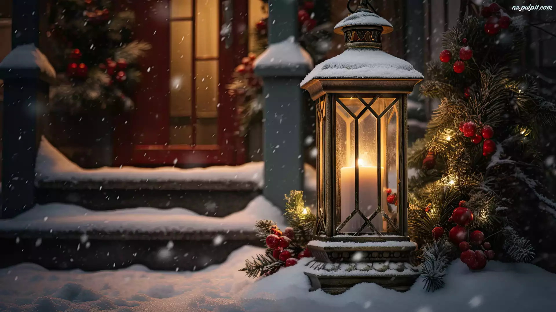 Jagody, Świeca, Śnieg, Zima, Drzwi, Schody, Lampion, Gałązki Na Pulpit