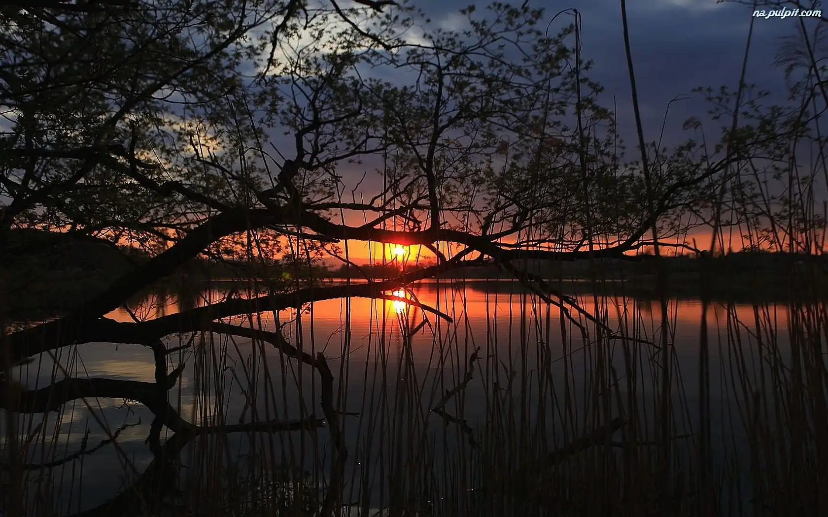 Gałęzie, Słońca, Zachód, Jezioro, Zarośla Na Pulpit