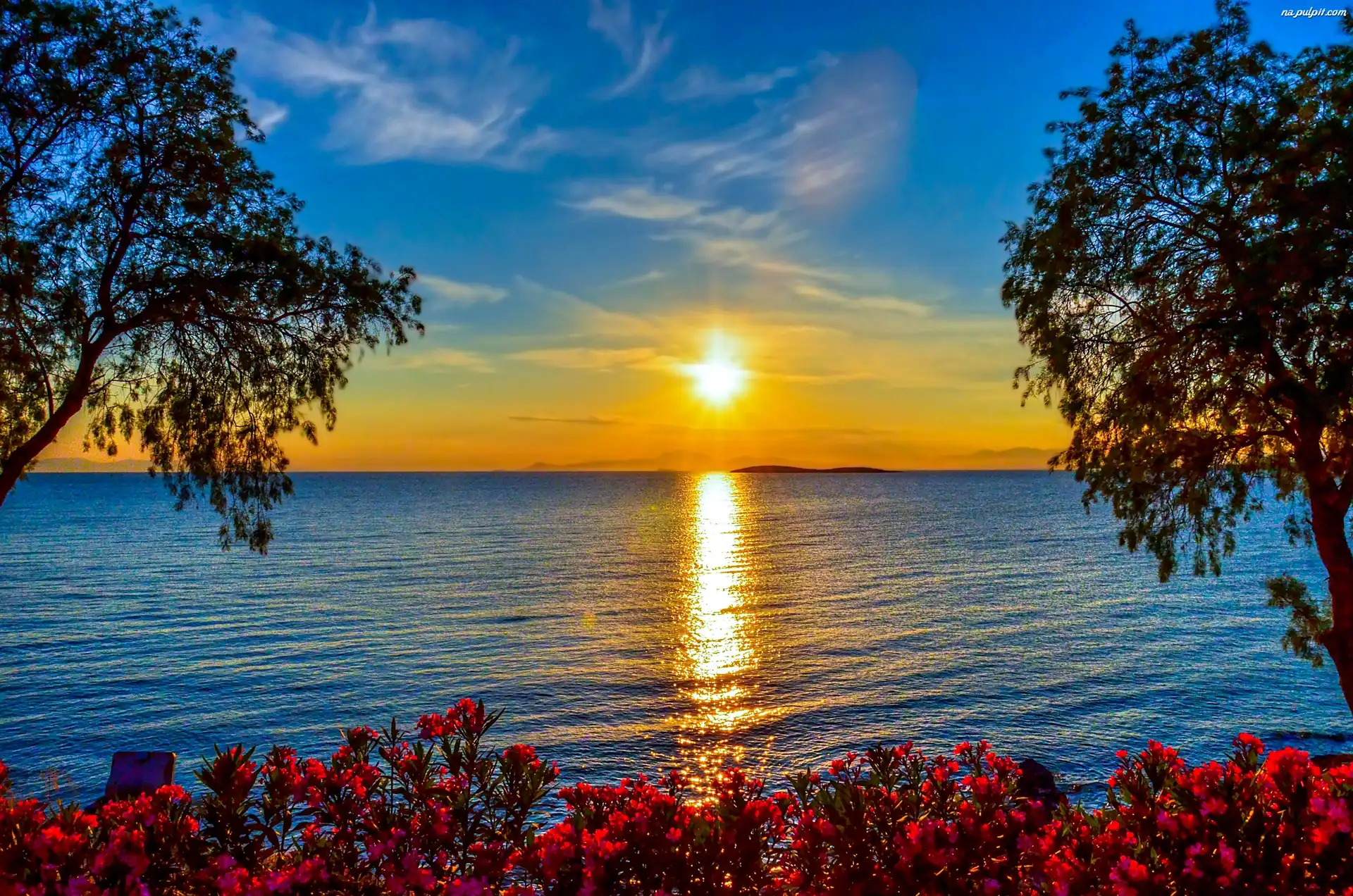 Gałęzie, Zachód Słońca, Morze, Krzewy