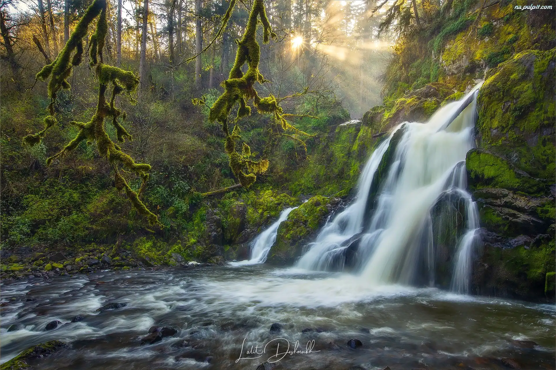 Omszałe, Gałęzie, Wodospad, Zachód słońca Na Pulpit