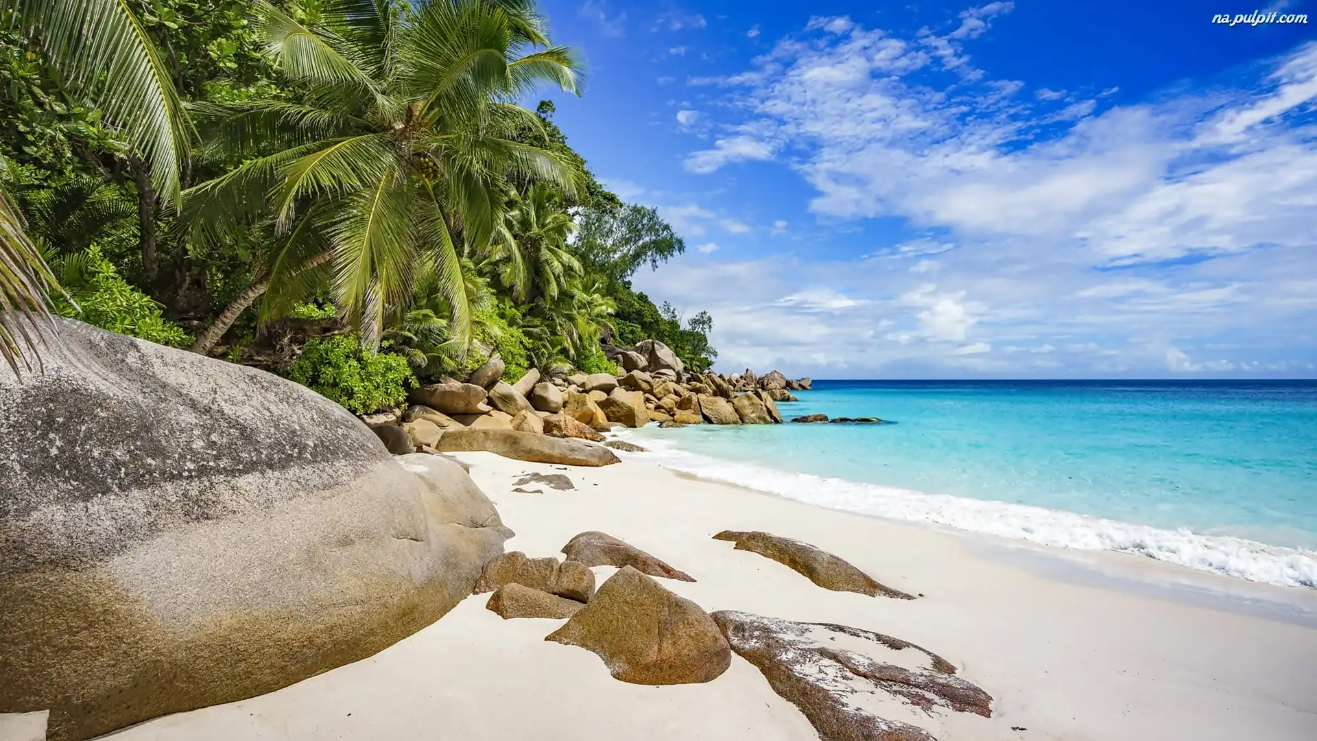 Skały, Wyspa Praslin, Morze, Palmy, Tropiki, Plaża, Seszele, Anse Georgette Na Pulpit