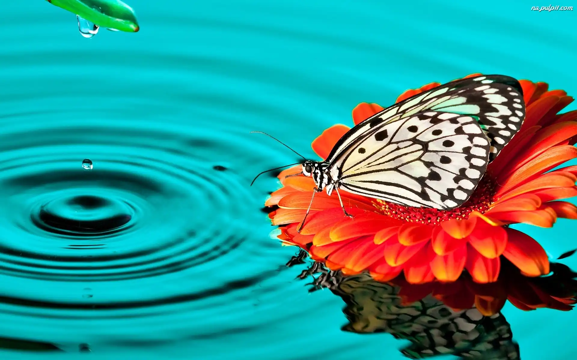 Gerbera, Polowiec szachownica, Motyl, Woda, Kwiat Na Pulpit