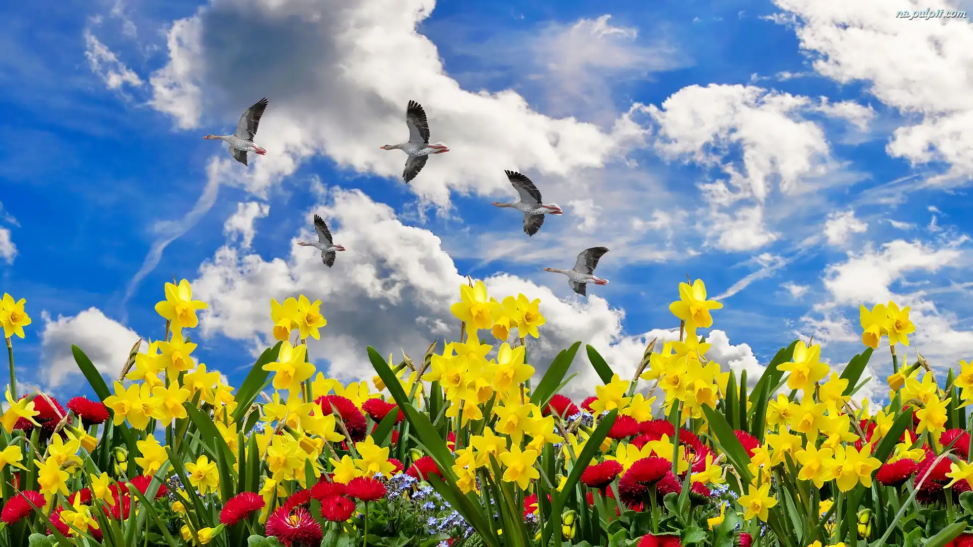 Chmury Narcyz, Kwiaty, Niebo, Ptaki, Narcyzy żonkile, Wiosna, Gęsi Na Pulpit