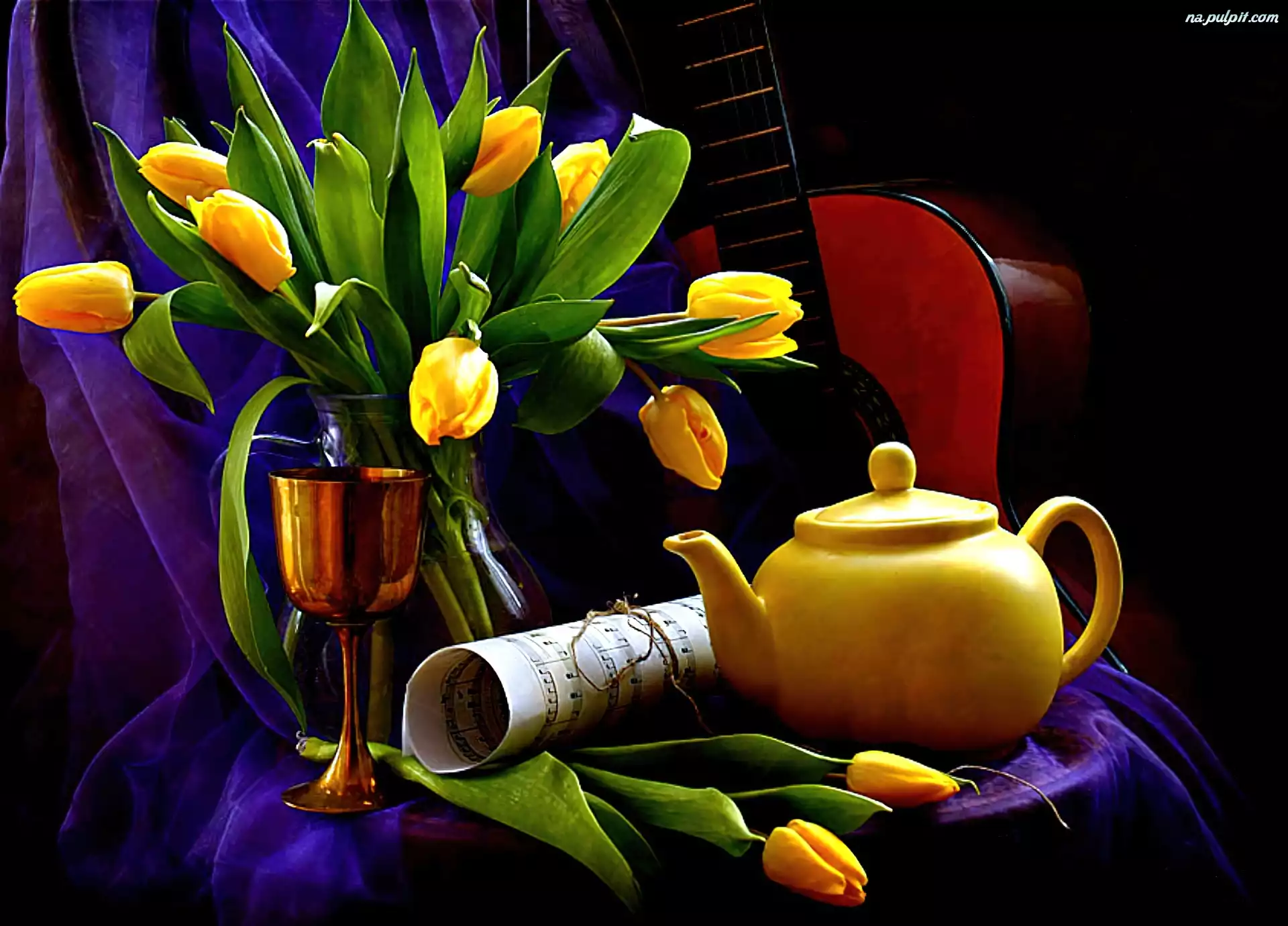 Gitara, Kielich, Dzbanek, Tulipany, Nuty