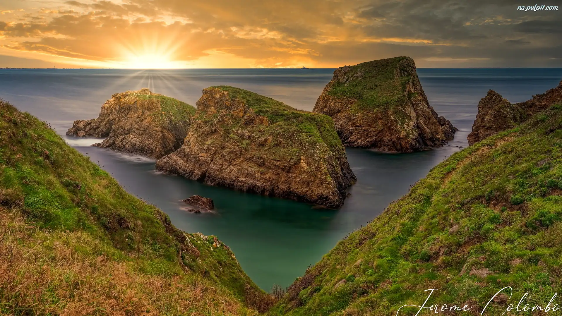 Francja, Skały, Gmina Plogoff, Cypel, Promienie słońca, Morze, Pointe du Van Na Pulpit