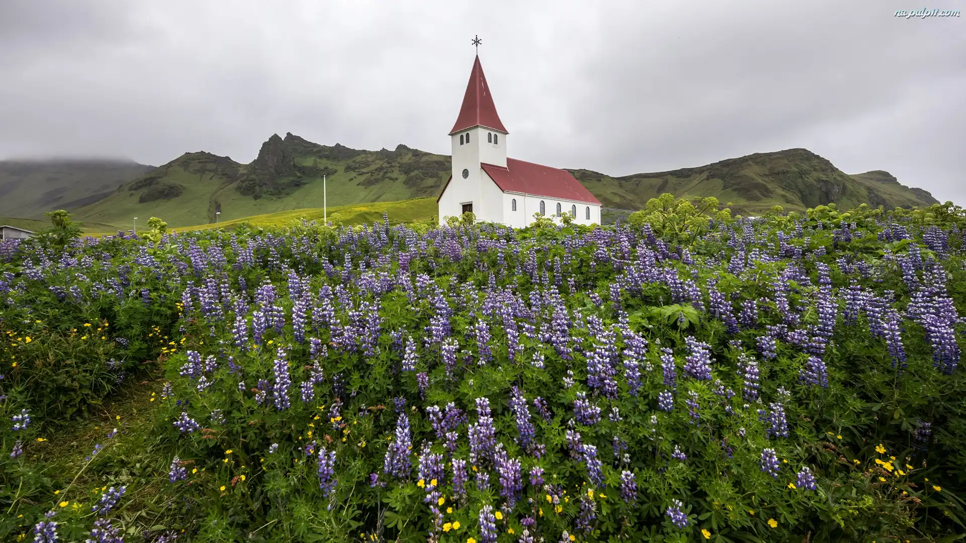 Łubin, Gmina Myrdalshreppur, Islandia, Góry, Kościół, Miejscowość Vik i Myrdal Na Pulpit