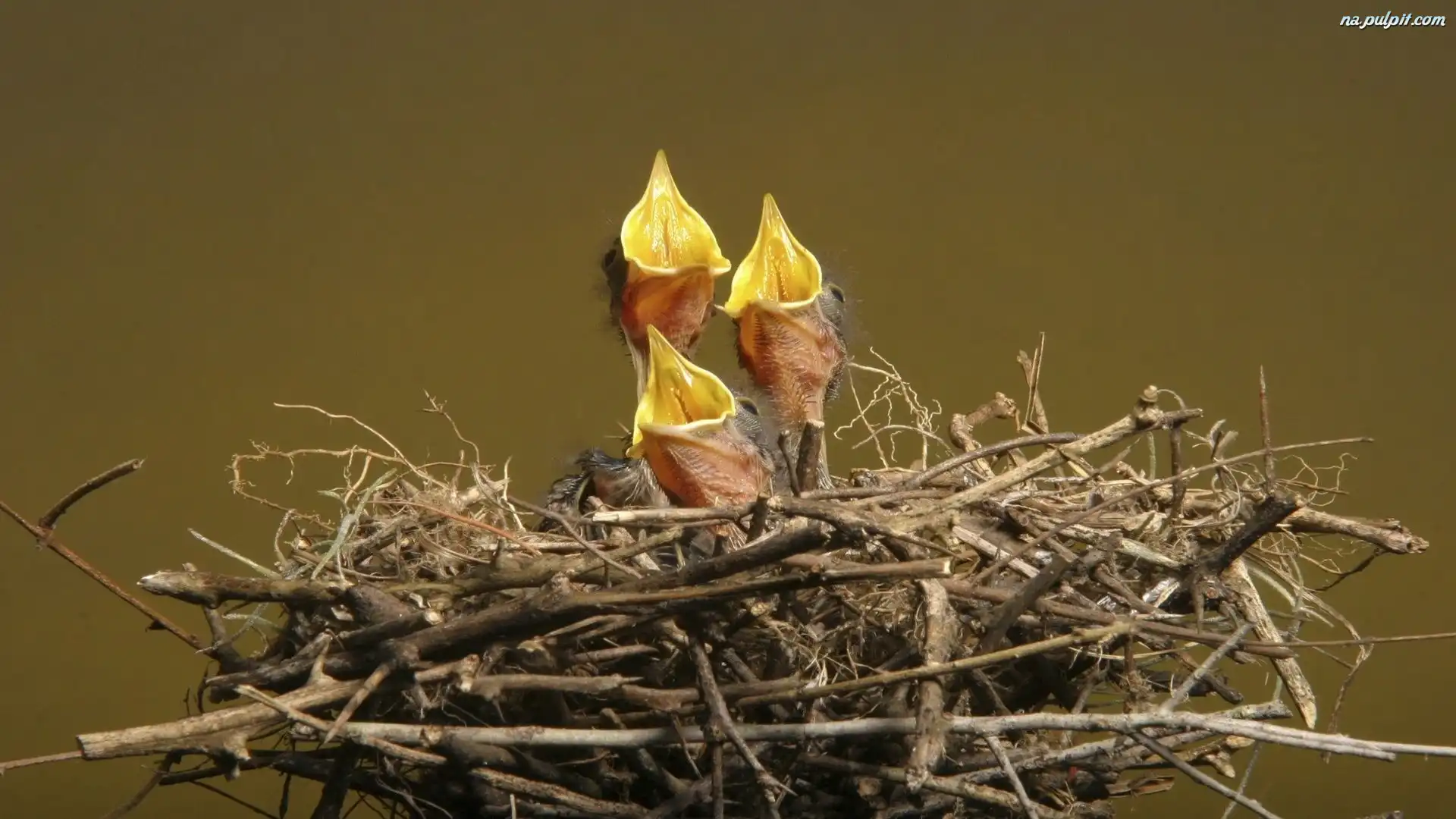Gniazdo, Otwarte, Pisklaki, Trzy, Dzioby