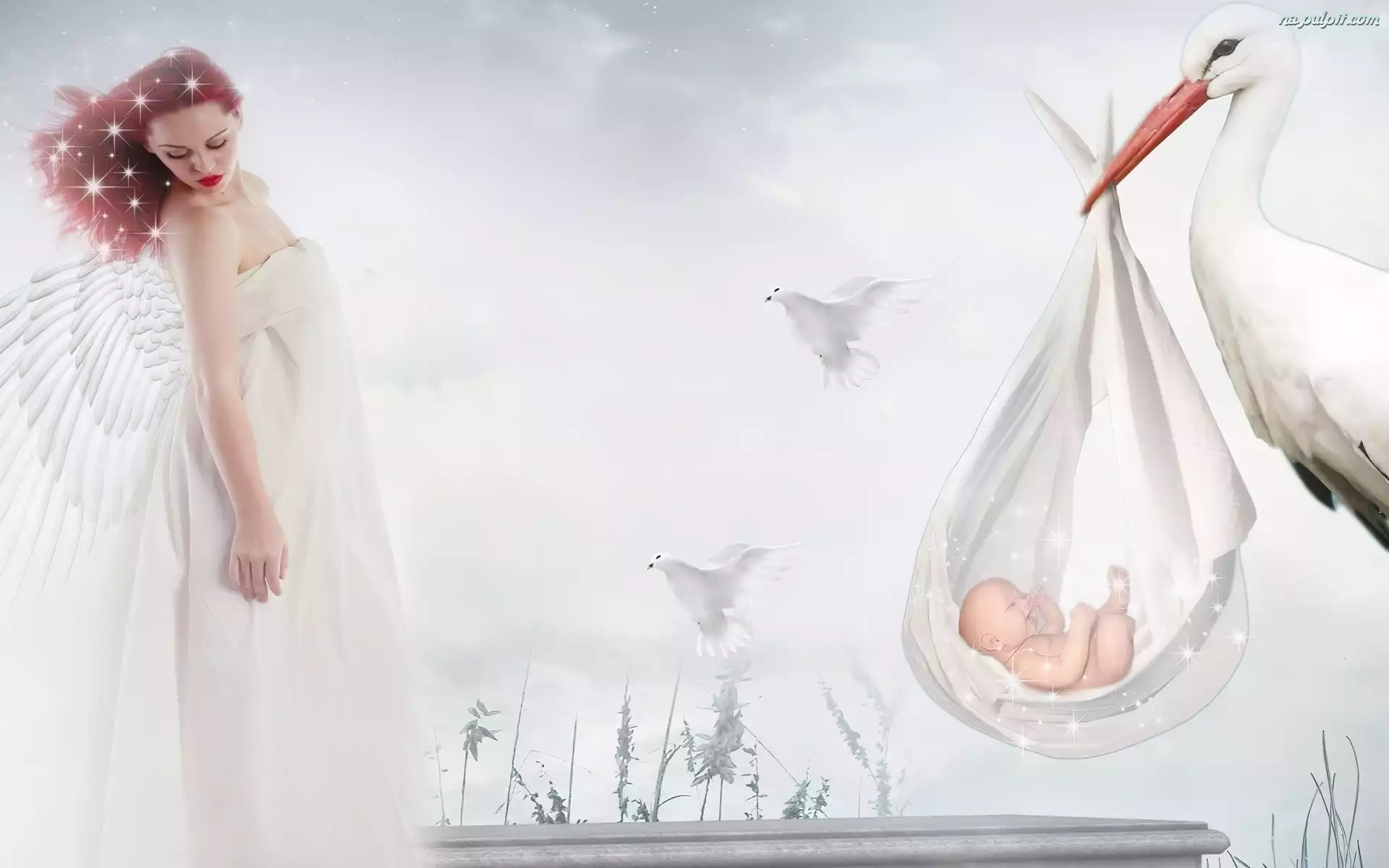 Gołębie, Bocian, Kobieta, Fantasy, Dziecko