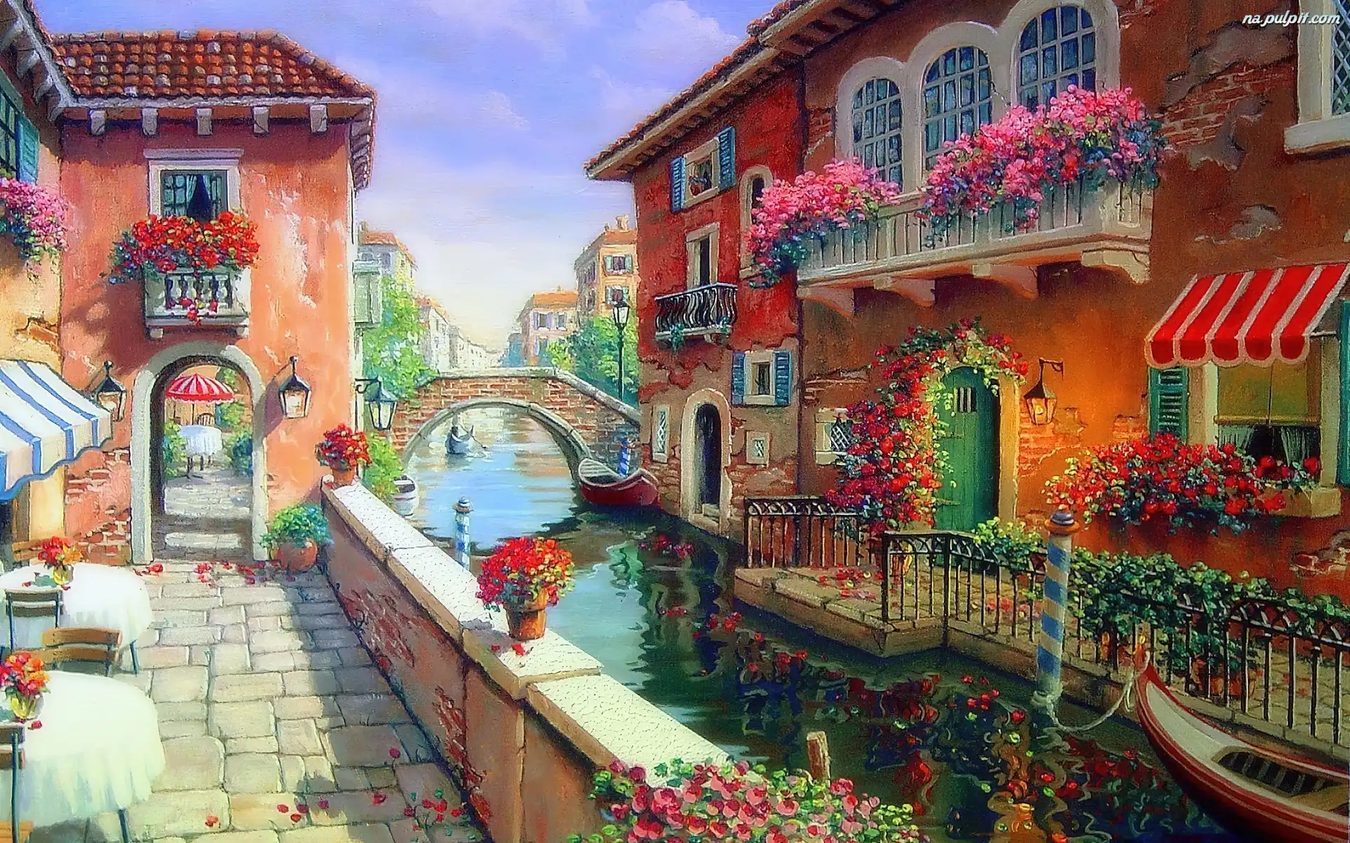 Gondole, Wenecja, Obraz, Domy, Kanał, Kwiaty Na Pulpit