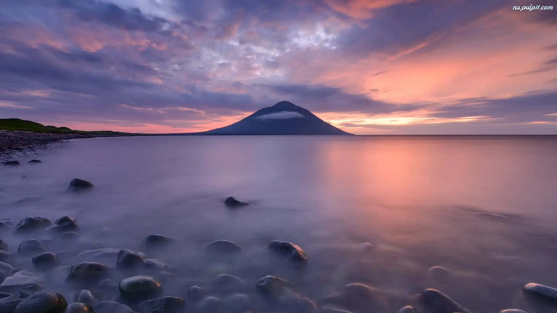 Atsonupuri, Kamienie, Zachód słońca, Góra, Wyspa Iturup, Obwód sachaliński, Rosja, Morze, Stratowulkan, Wyspy Kurylskie Na Pulpit |