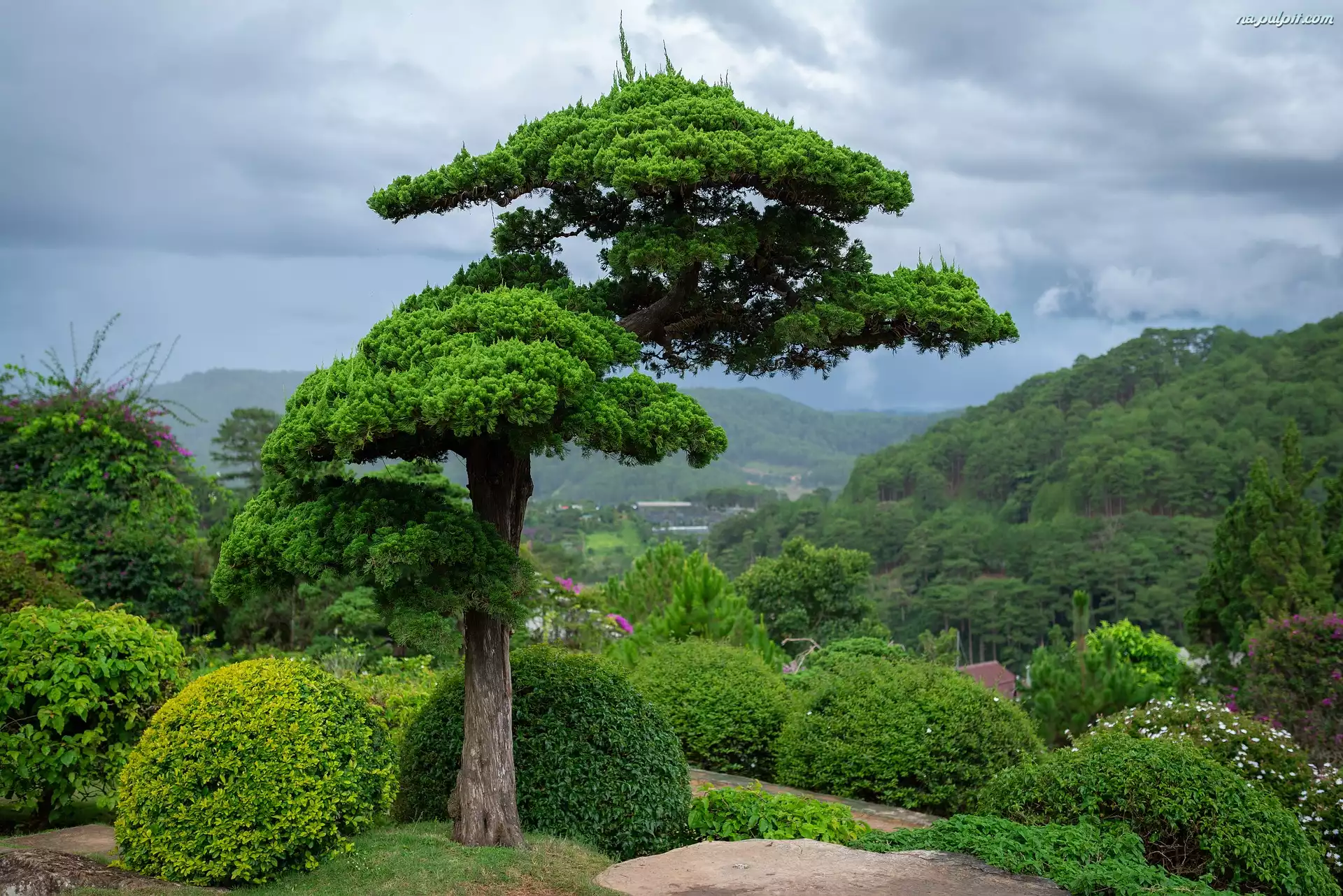 Krzewy, Niebo, Bonsai, Góra, Drzewo, Cedr, Chmury Na Pulpit
