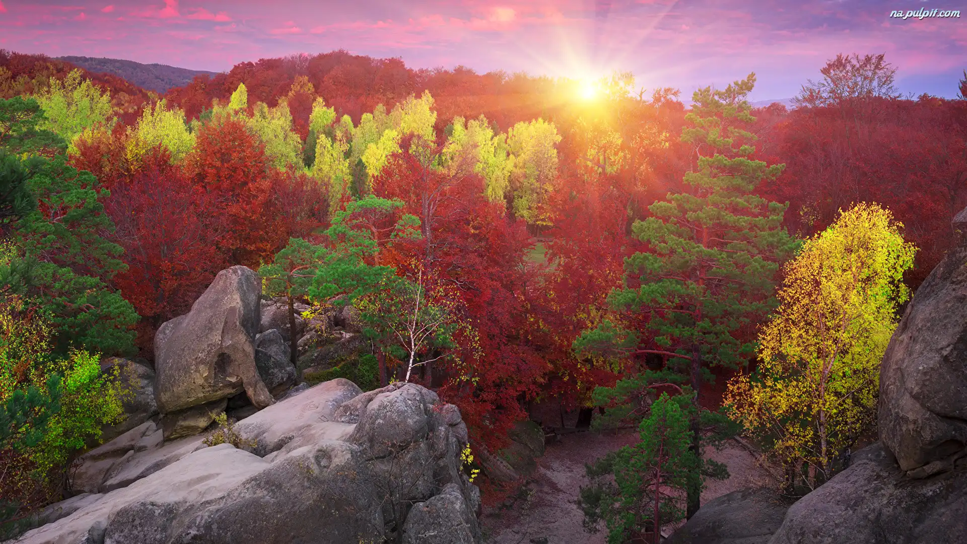 Jesień, Góra, Promienie słońca, Skały, Drzewa, Las, Turnia Na Pulpit