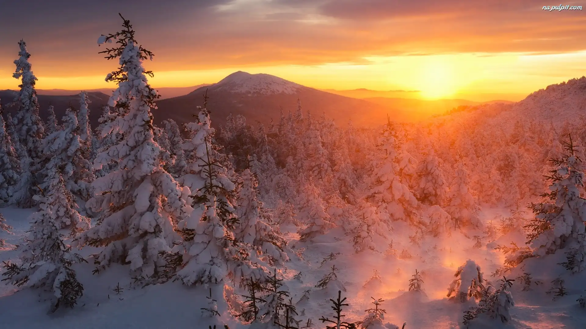 Góra, Świerki, Ośnieżone, Zima, Zachód słońca Na Pulpit