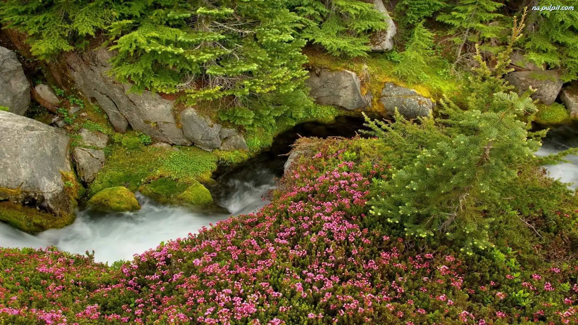 Górski, Kwiatki, Mchy, Skały, Potok, Drzewa Na Pulpit