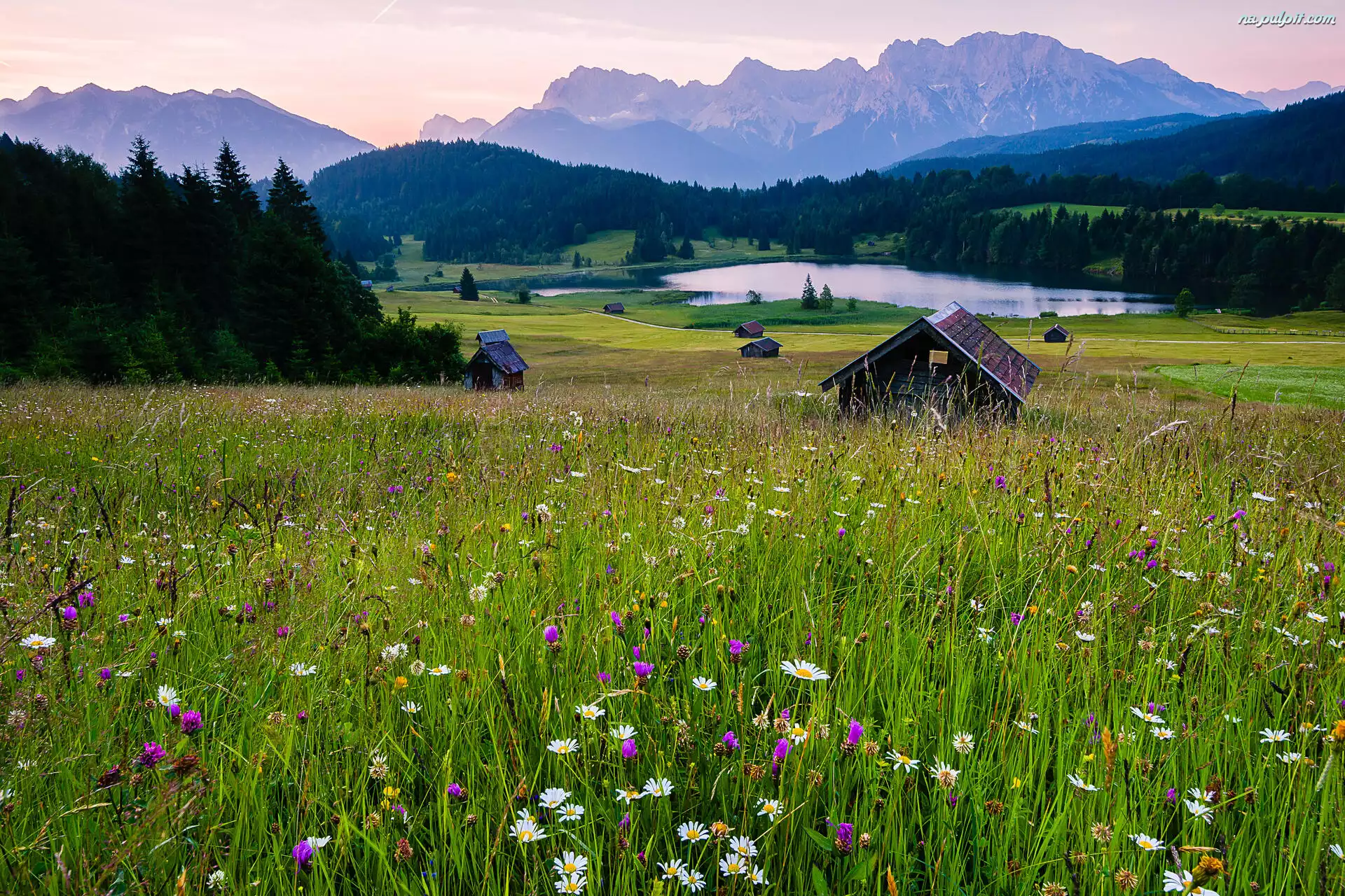 Łąka, Kwiaty, Alpy, Góry, Szopy, Domki, Drzewa, Bawaria, Niemcy, Jezioro Geroldsee, Polana, Lasy Na Pulpit |