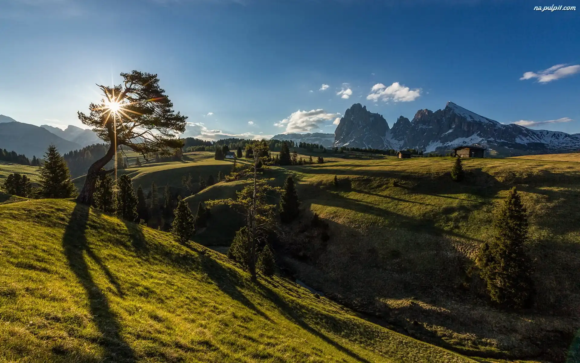Góry, Drzewa, Łąka, Słońce Na Pulpit