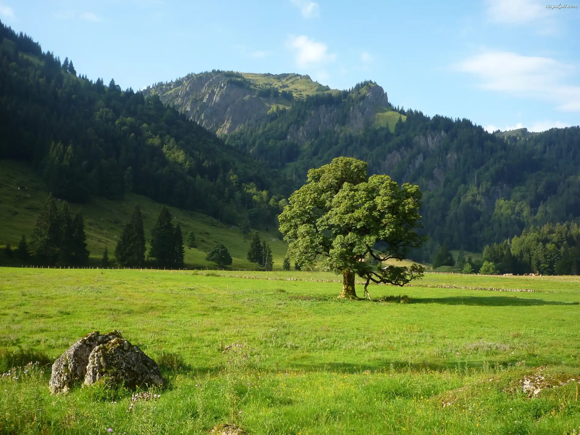 Góry, Drzewo, Łąka, Zalesione Na Pulpit