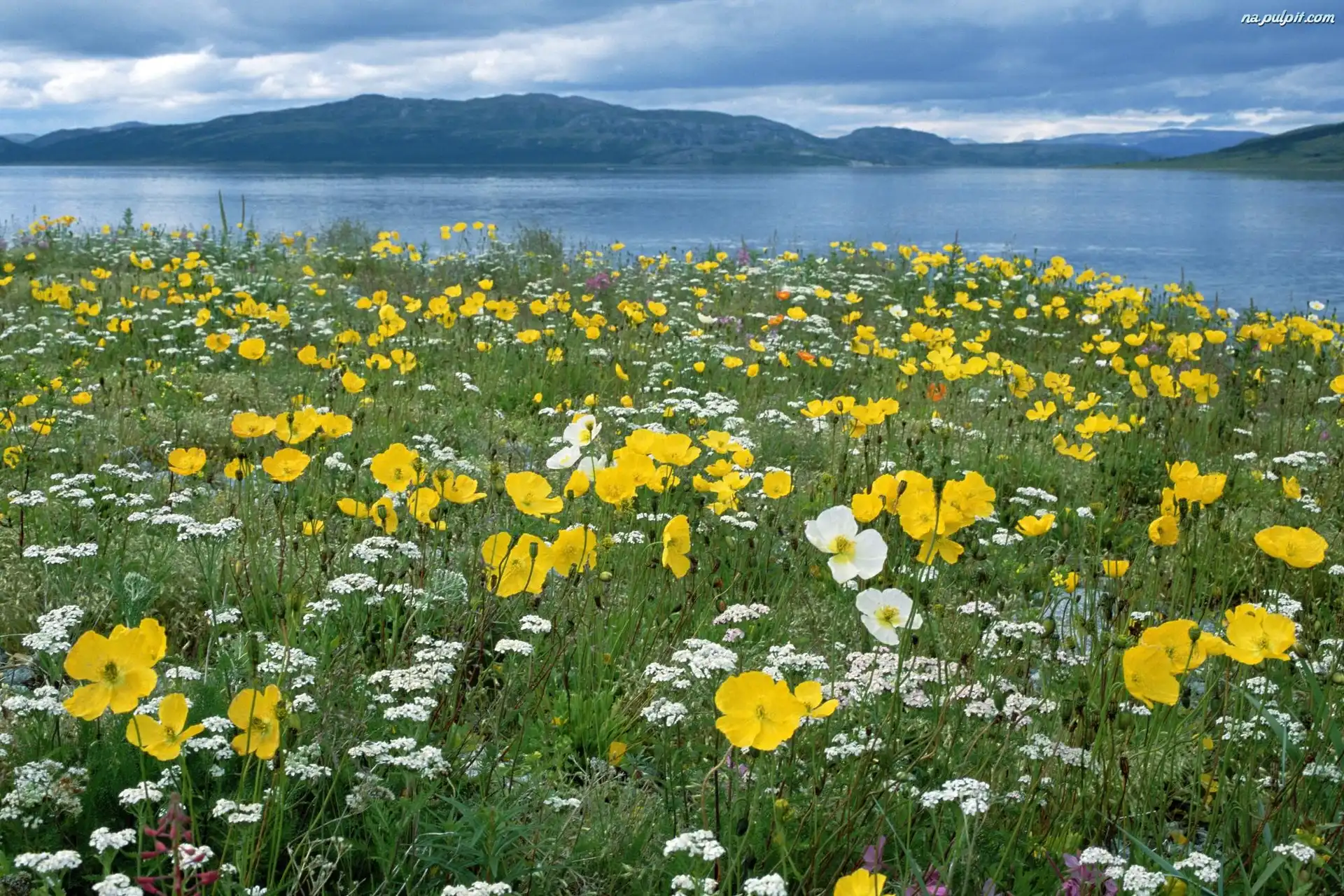 Góry, Kwiaty, Łąka, Morze Na Pulpit