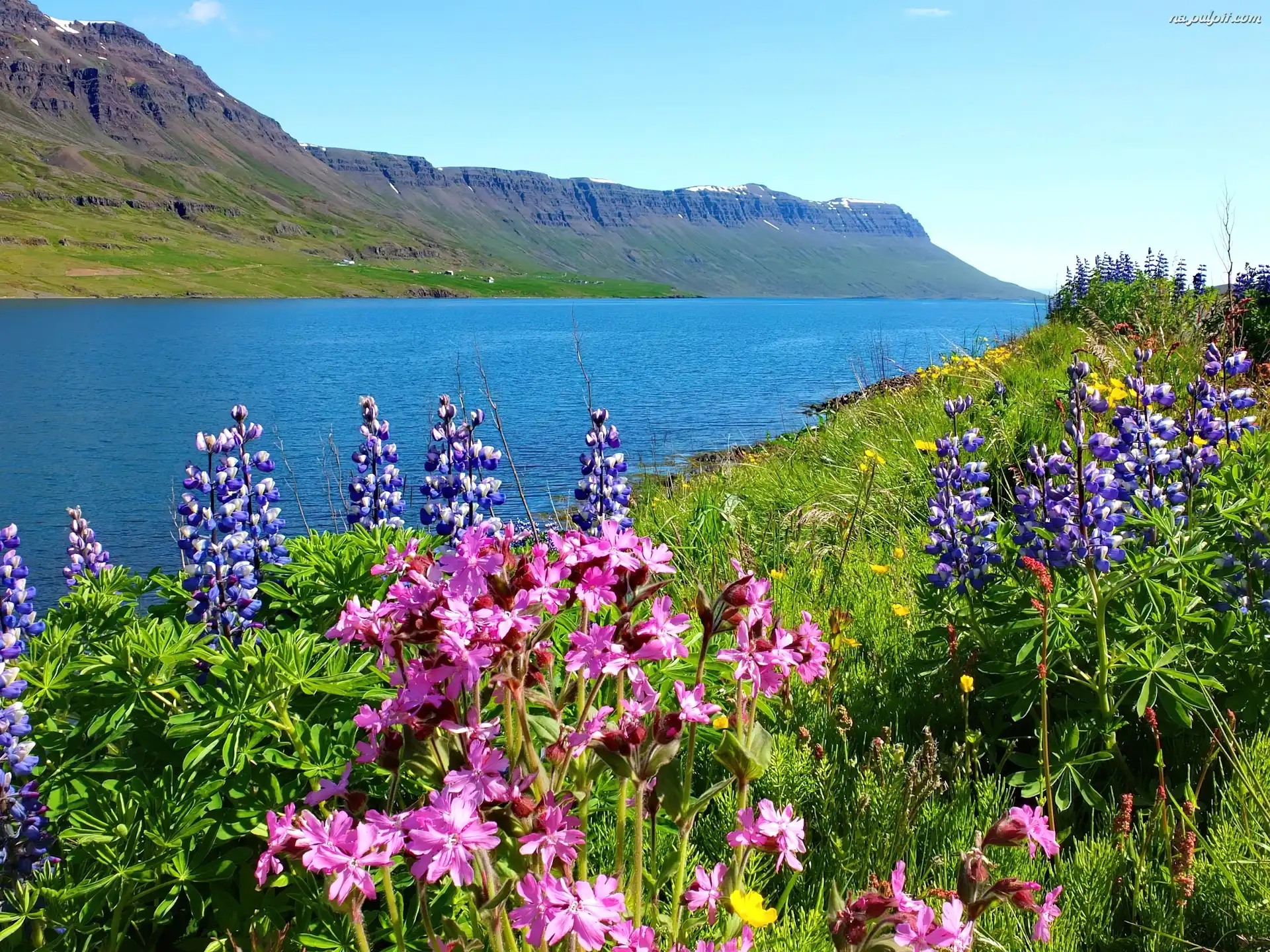 Góry, Kwiaty, Łąka, Rzeka Na Pulpit