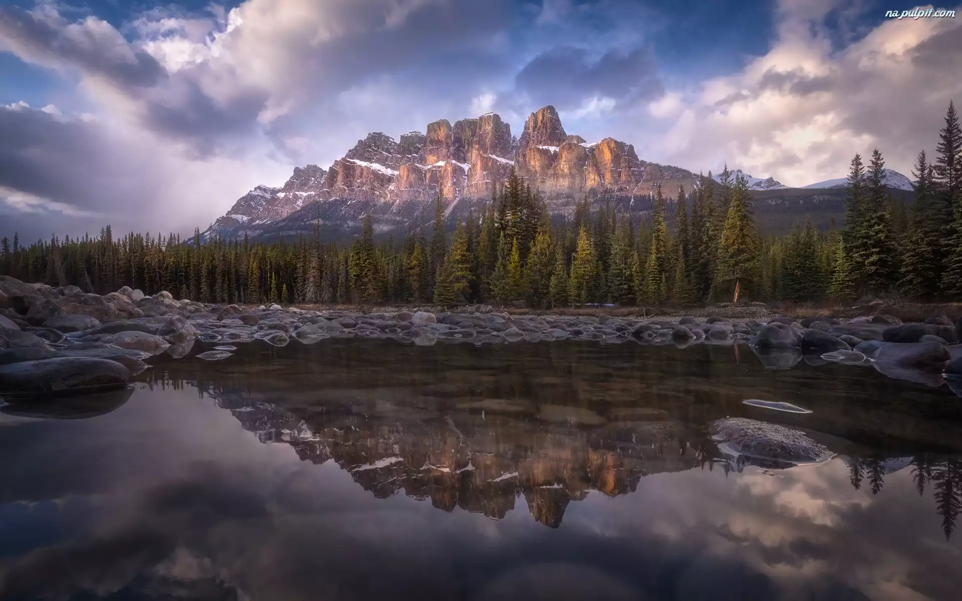 Góry, Rzeka, Kanada, Góra Castle Mountain, Kamienie, Chmury, Alberta, Drzewa, Bow River, Park Narodowy Banff, Kamienie Na Pulpit |