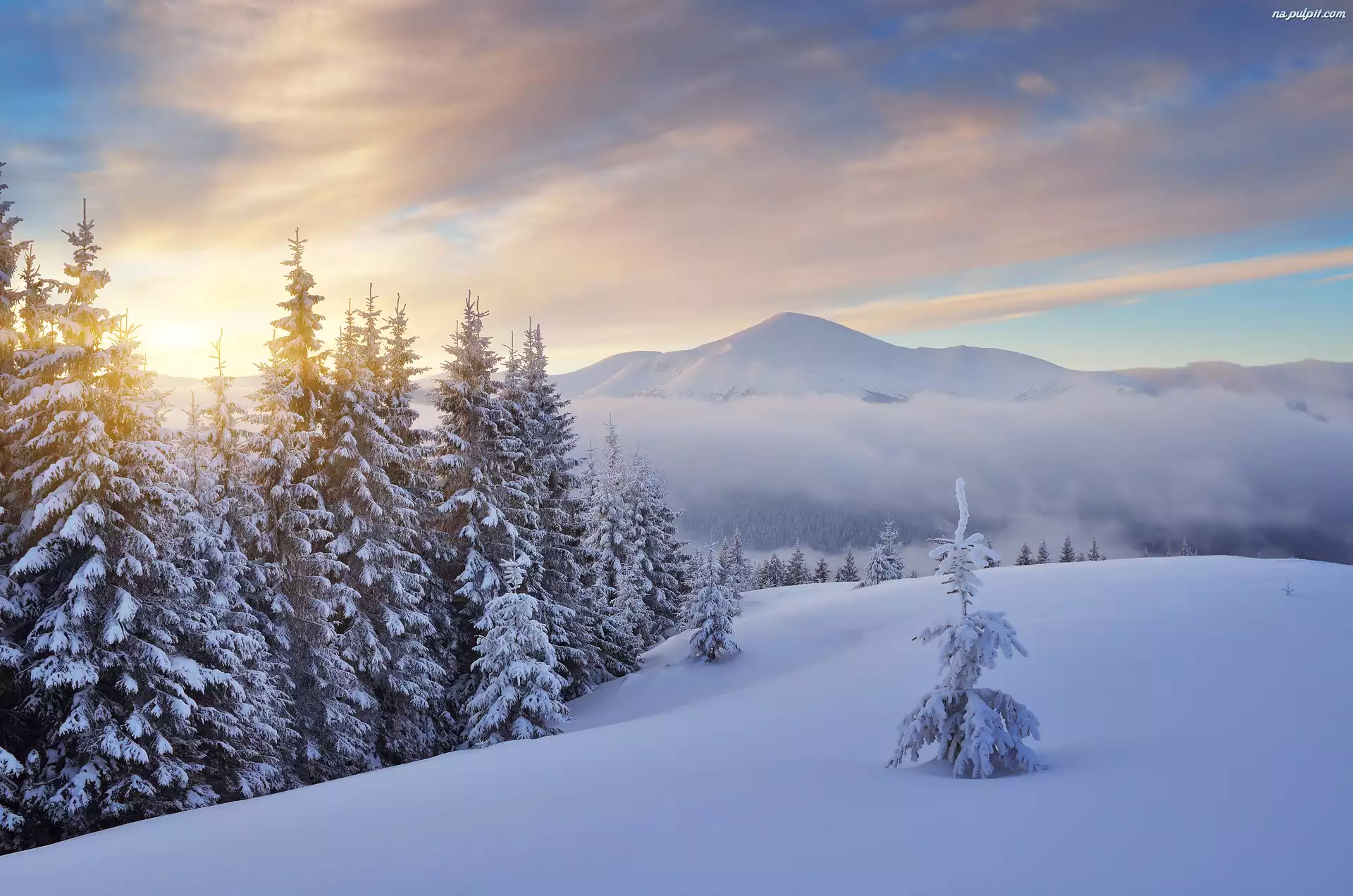 Świerki, Góry Karpaty, Chmury, Las, Szczyt Howerla, Ukraina, Wschód słońca Na Pulpit