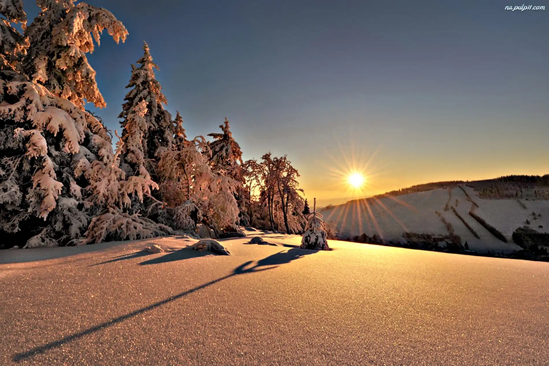 Góry, Słońca, Zachód, Choinki, Śnieg Na Pulpit