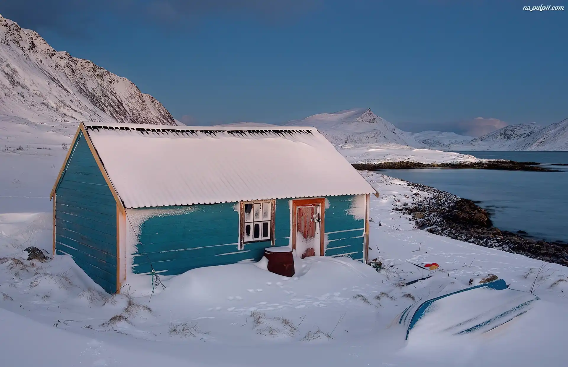 Góry, Śnieg, Domek, Rzeka