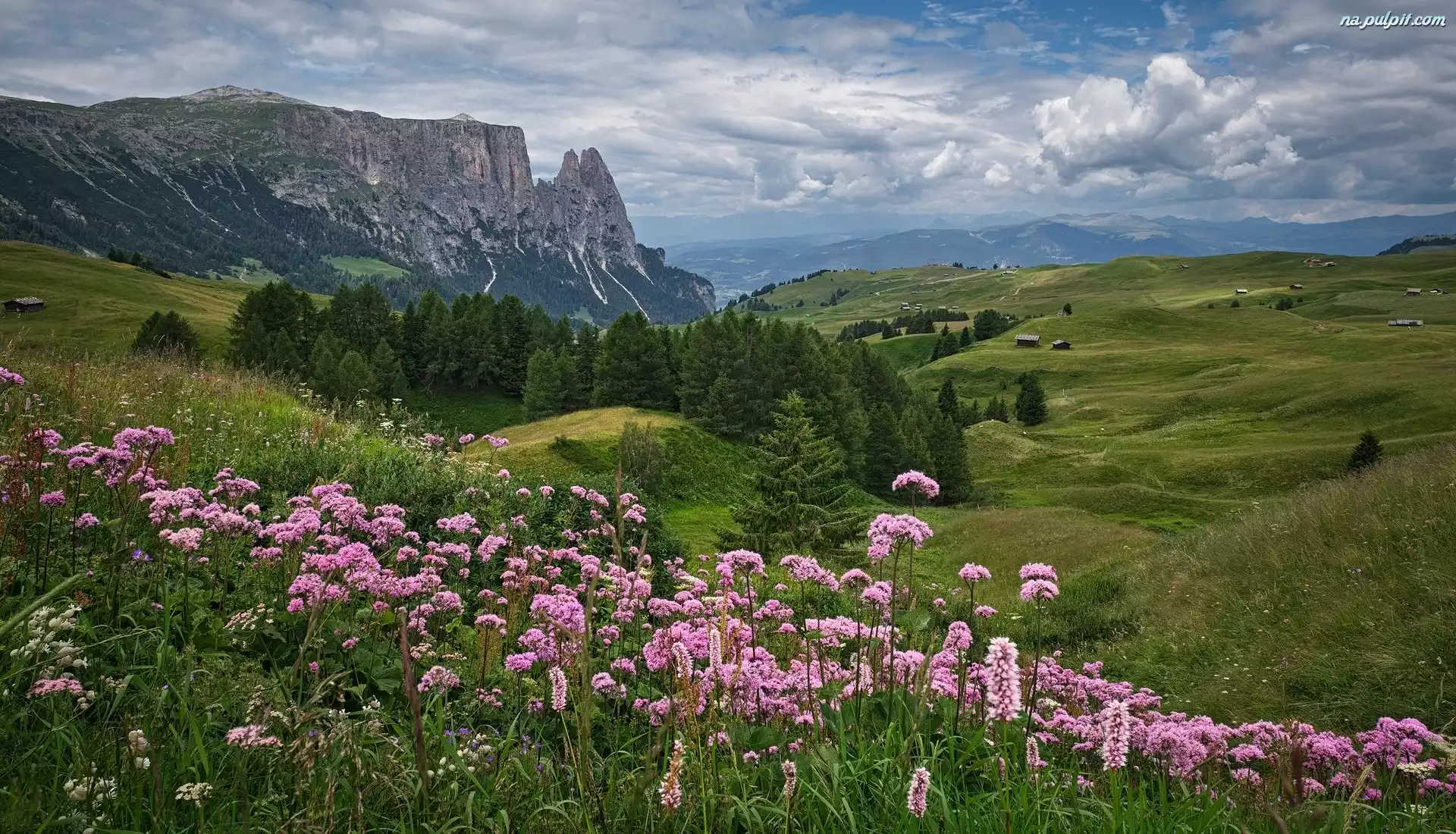Chmury, Łąka, Domy, Góry, Las, Drzewa, Roślinność Na Pulpit