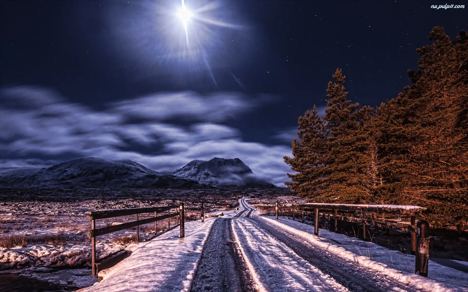 Góry, Słońca, Zima, Las, Droga, Promienie