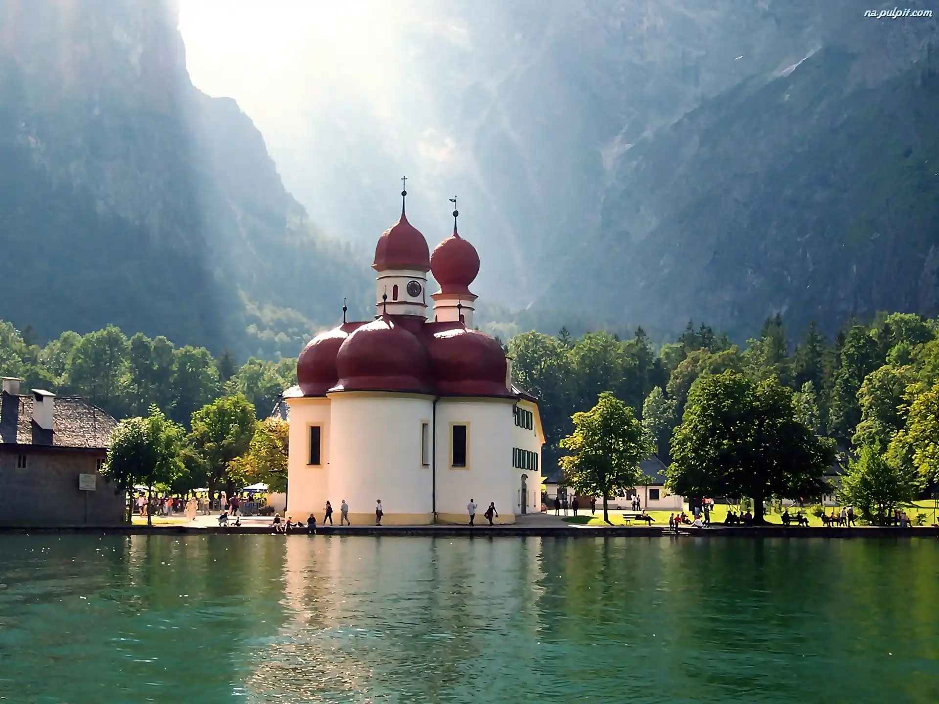 Drzewa, Góry, Budynek, Koenigssee, Jezioro, Bawaria, Kościół