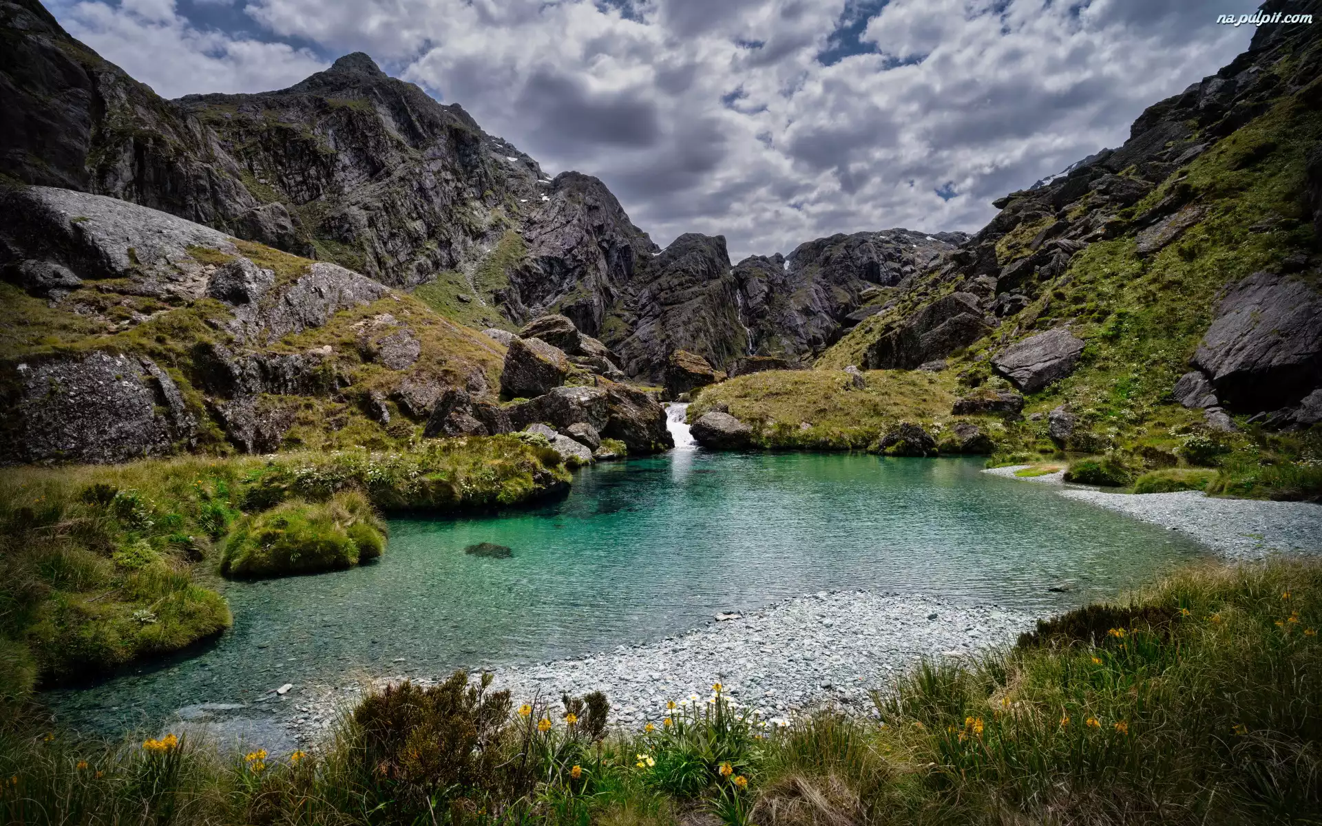 Chmury, Skały, Drzewa, Góry, Jezioro, Trawa, Kamienie