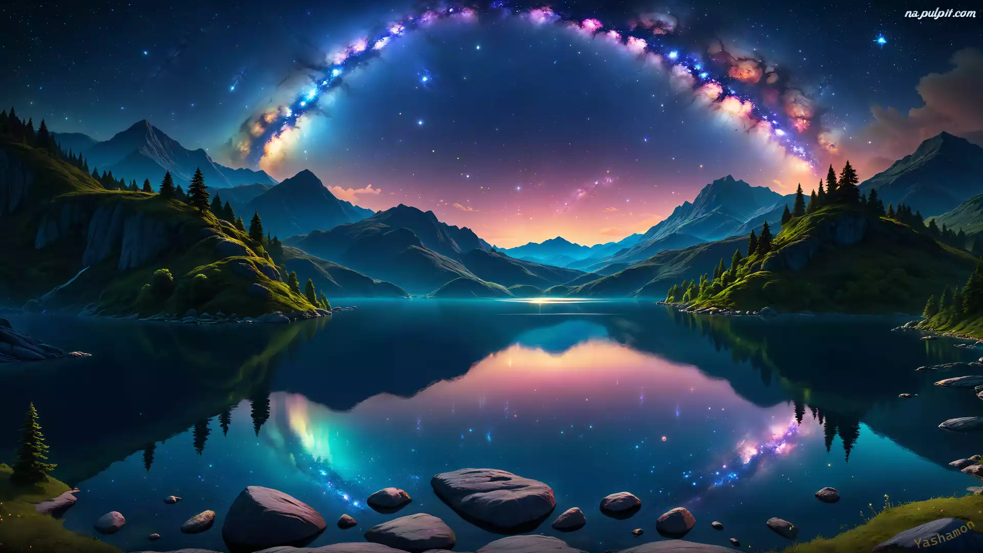 Kamienie, Noc, 2D, Jezioro, Niebo, Odbicie, Góry, Gwiazdy, Droga mleczna, Drzewa Na Pulpit