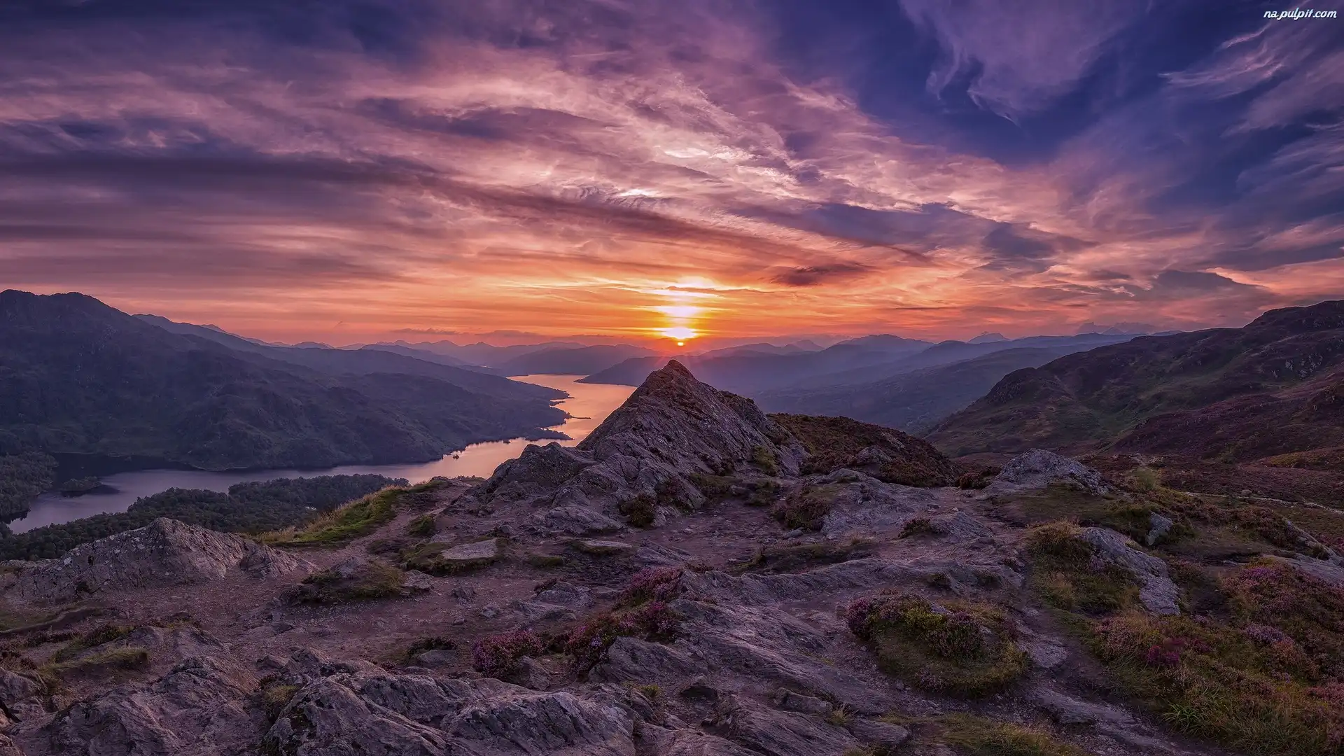 Góry, Wzgórze Ben Aan, Zachód słońca, Hrabstwo Stirling, Jezioro Loch Katrine, Park Narodowy Loch Lomond and the Trossachs, Szkocja Na Pulpit |