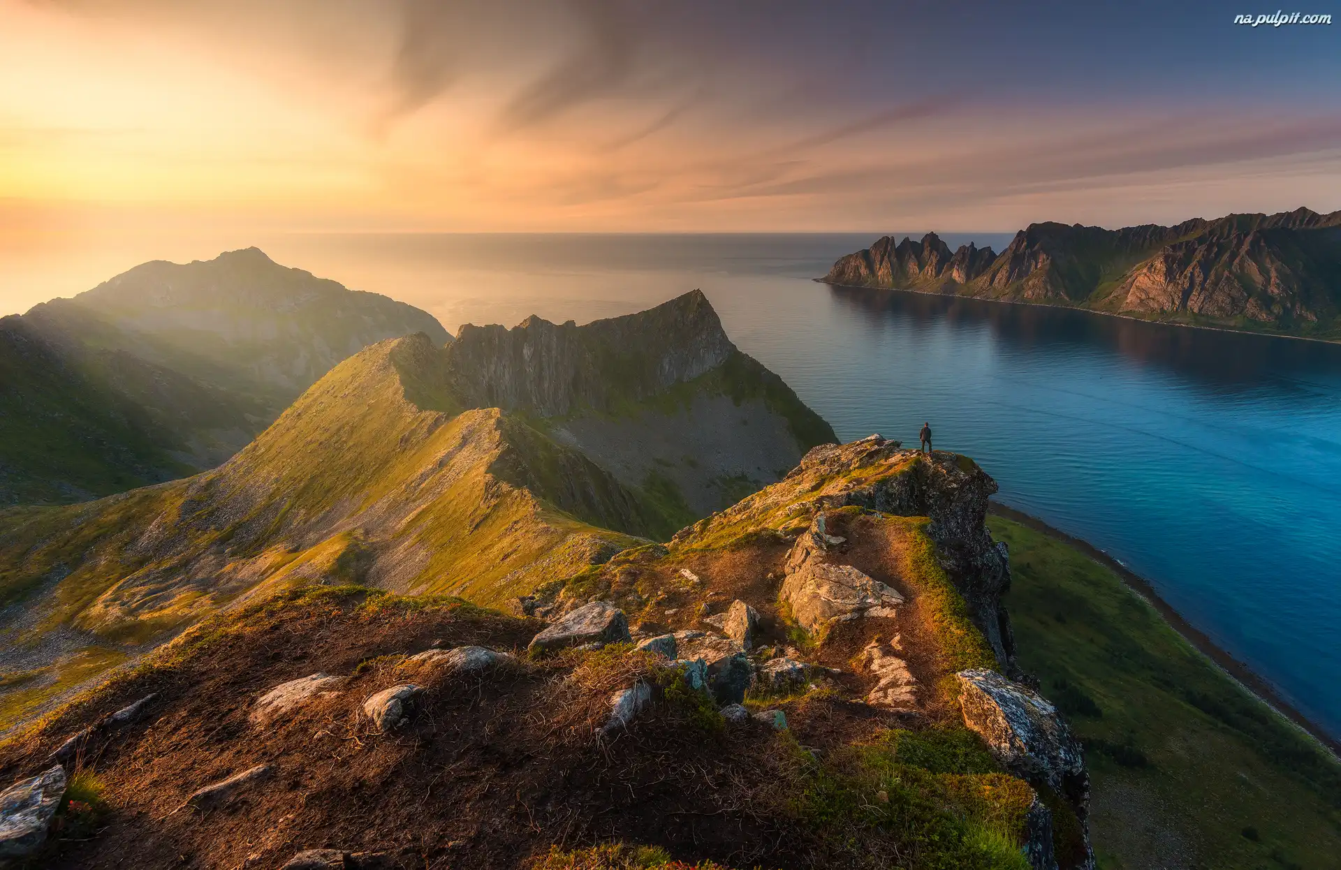 Morze, Szczyt Husfjellet, Norwegia, Wyspa Senja, Zachód słońca, Góry Na Pulpit