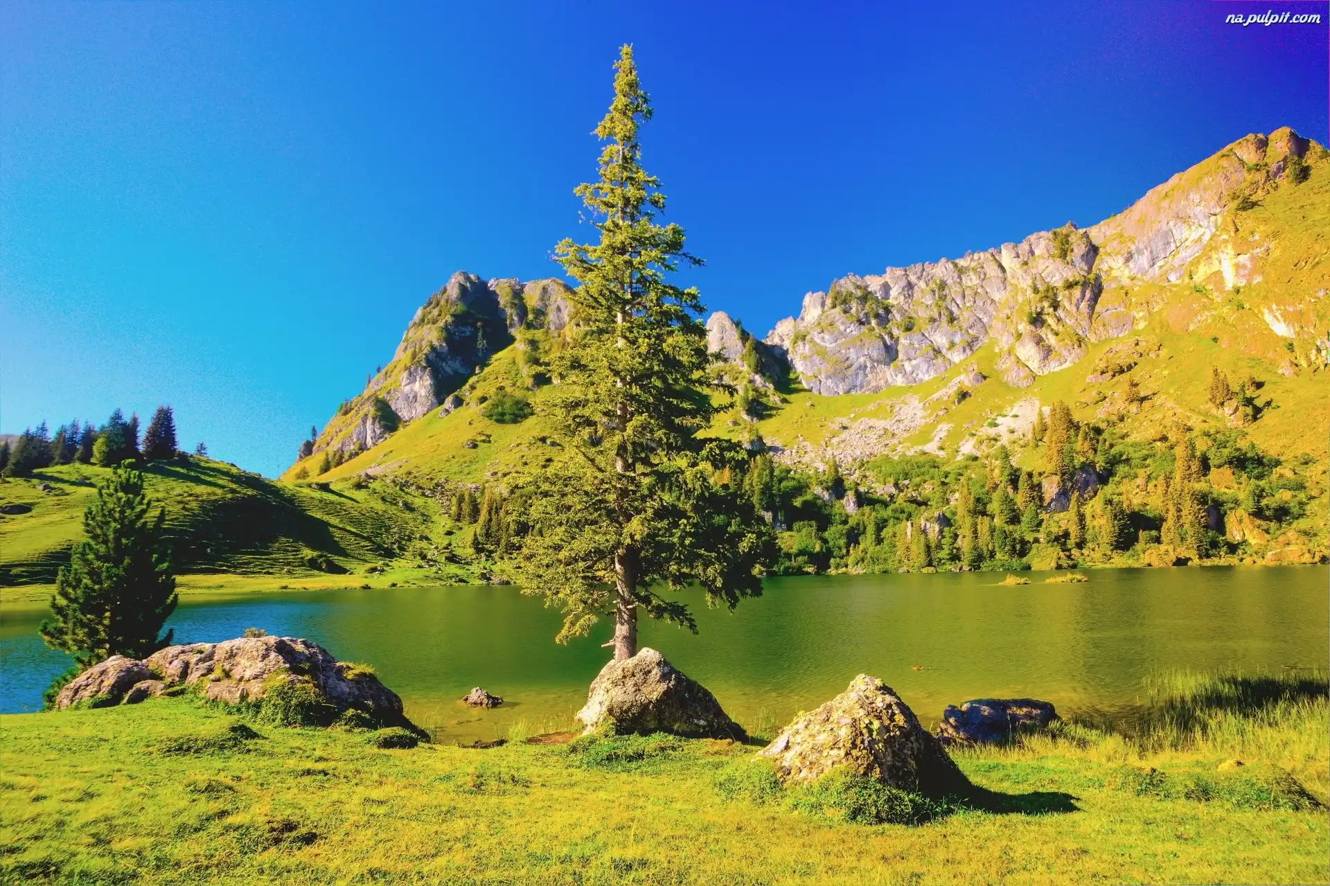 Kamienie, Góry, Jezioro Ławka, Jesień, Jezioro Polska, Morskie, Oko Jezioro, Góry, Chmurki Plaża, Fale, Góry, Morze Góra Góra Góra, Jeziora Góra Góry, Krzewy palmy, Chmura, Góry, Niebo Góry, śnieg domki, Góry, dwa drzewa skały, Niebo