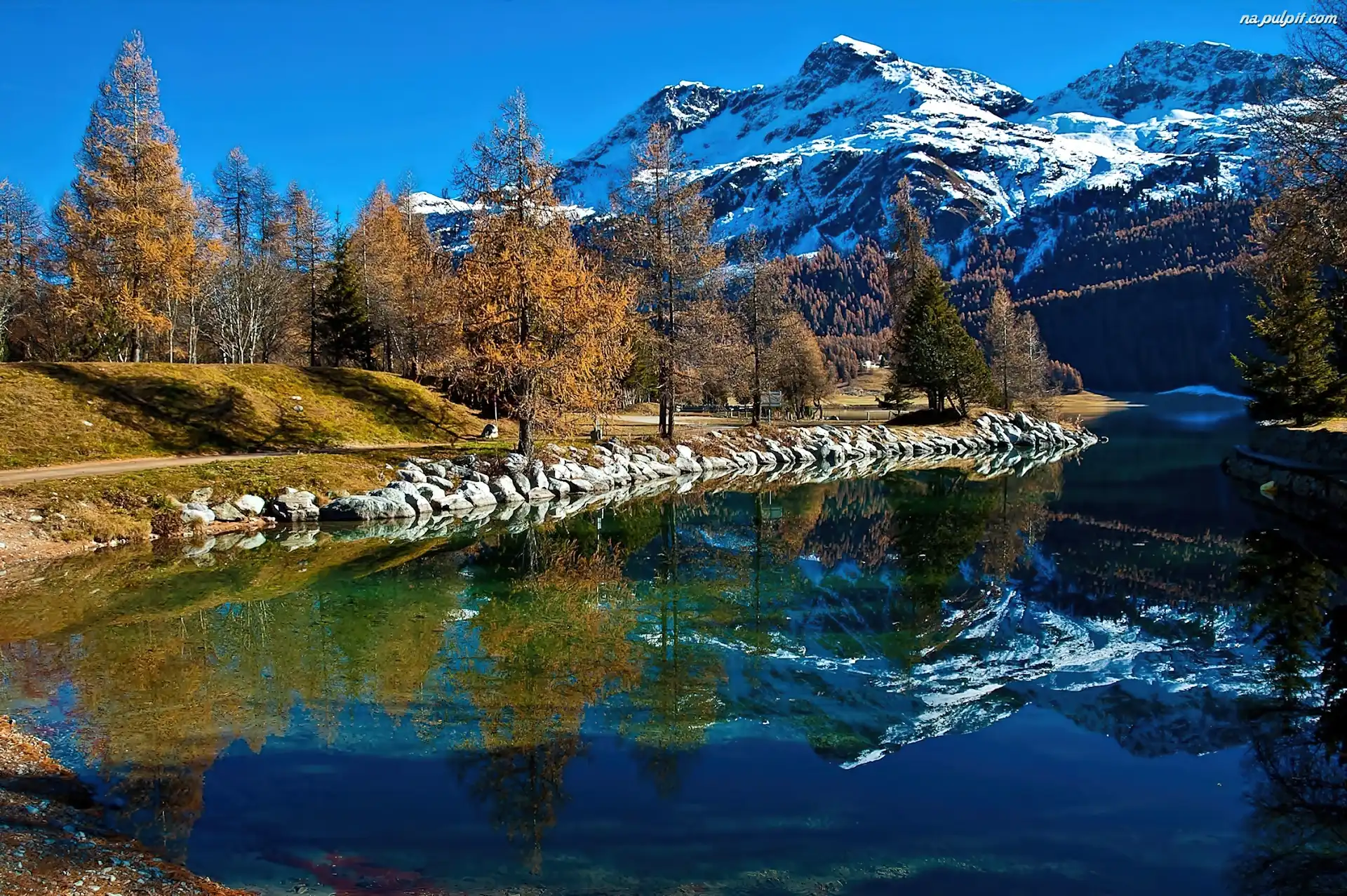 Świerki, Jezioro, Alpy, Góry, Silvaplana