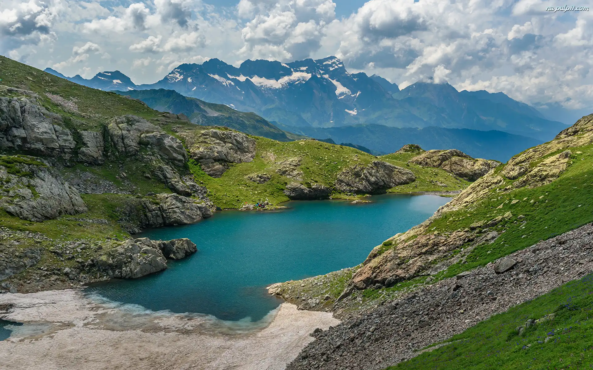 Góry, Roślinność, Chmury, Skały, Jezioro, Kamienie Na Pulpit