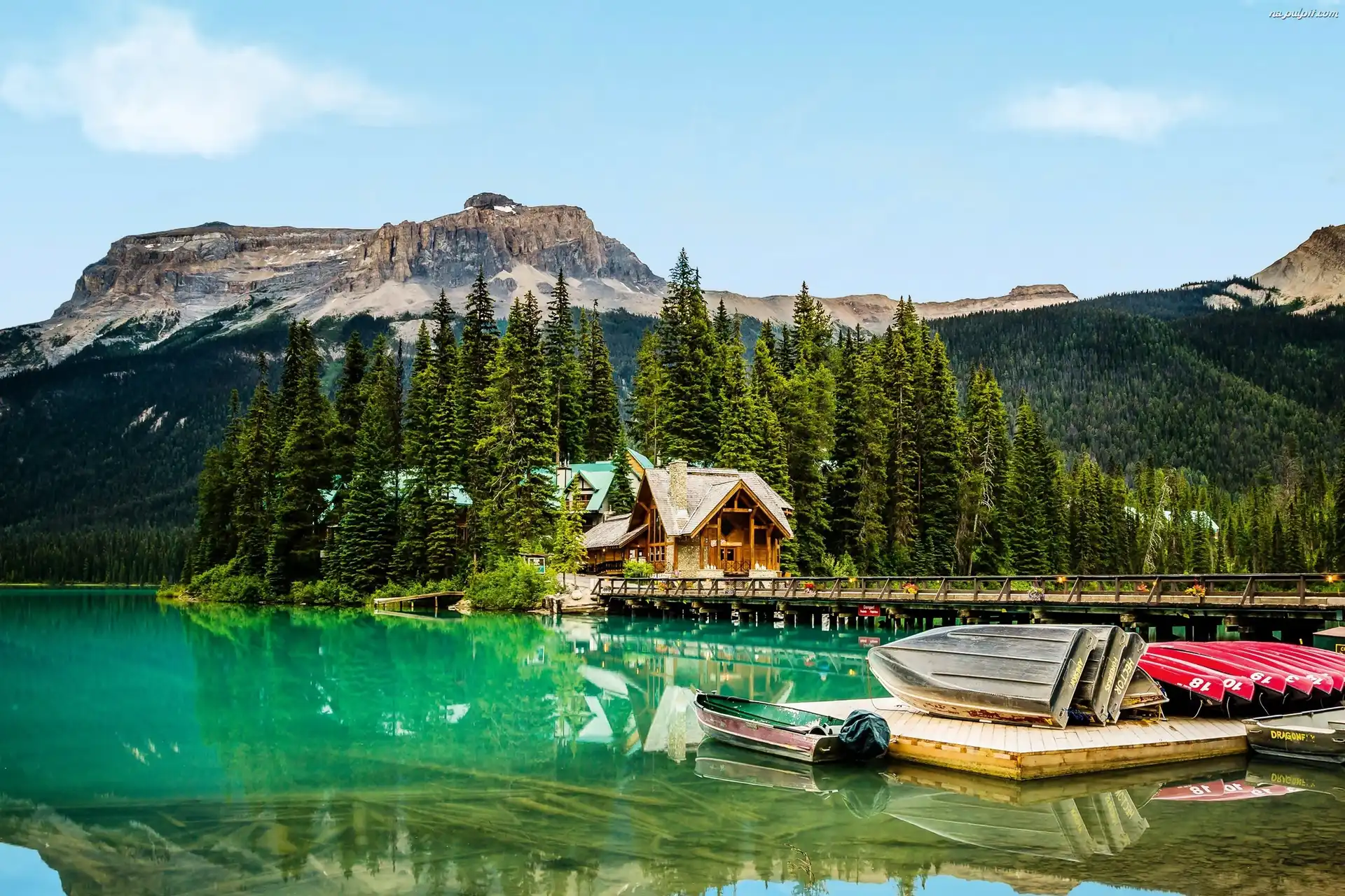 Góry, Molo, Domki, Las, Jezioro, Łodzie Na Pulpit