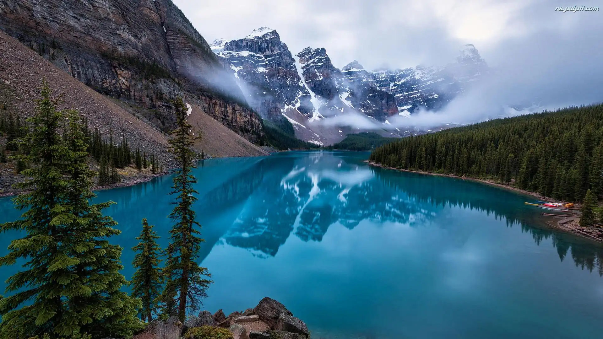 Góry, Drzewa, Kajaki, Chmury, Jezioro, Lasy Na Pulpit
