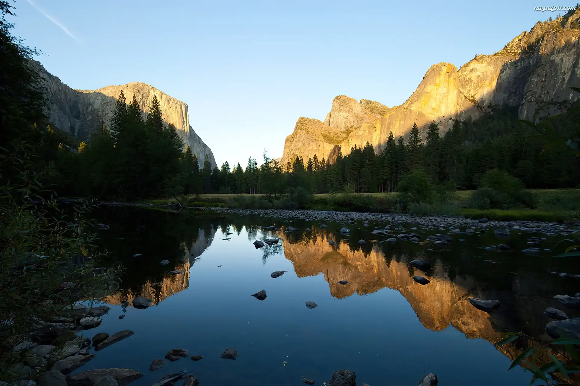 Góry, Yosemite, Kalifornia, Drzewa, Jezioro, Odbicie Na Pulpit